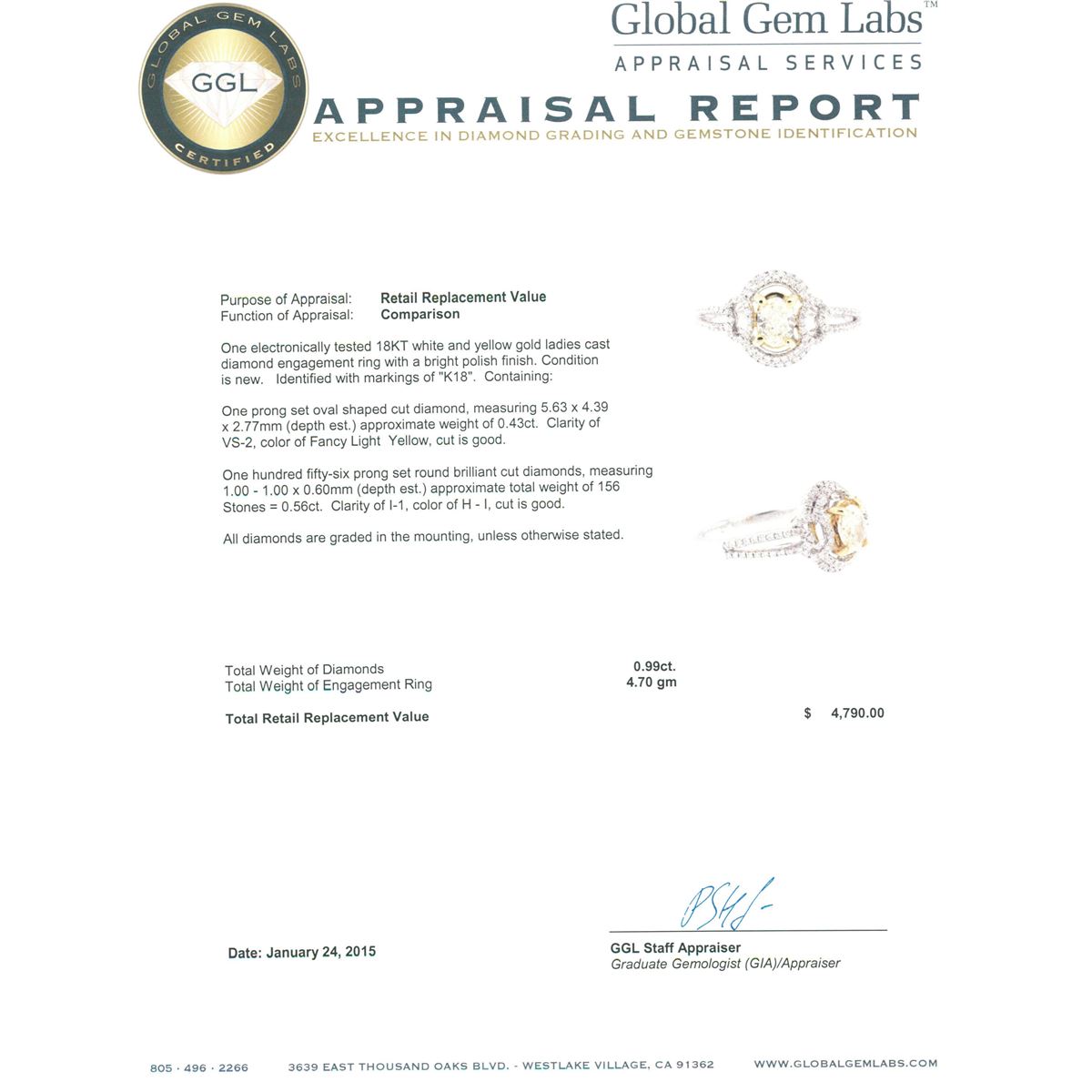 One electronically tested 18KT white and yellow gold ladies cast diamond engagement ring with a bright polish finish. Identified with markings of "K18". Condition is new. Containing: One prong set oval shaped cut diamond, measuring 5.63 x 4.39 x 2.77mm (depth est.) approximate weight of 0.43ct. Clarity: VS-2, Cut is Good. One Hundred Fifty-Six prong set round brilliant cut diamonds, measuring 1.00 - 1.00 x 0.60mm (depth est.) approximate total weight of 156 Stones = 0.56ct. Clarity: I-1. Color: H - I, Cut is Good. All diamonds are graded in the mounting, unless otherwise stated. Total Weight of Diamonds 0.99ct. Total Weight of Engagement Ring 4.70 grams. GGL Appraised at $4,790.00.