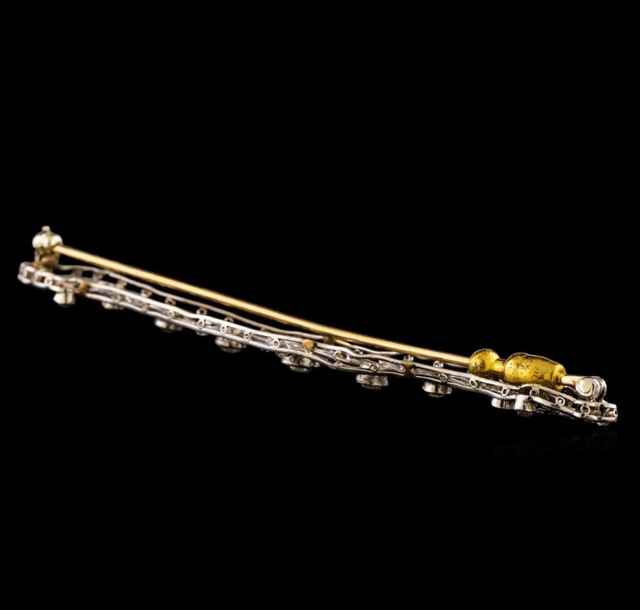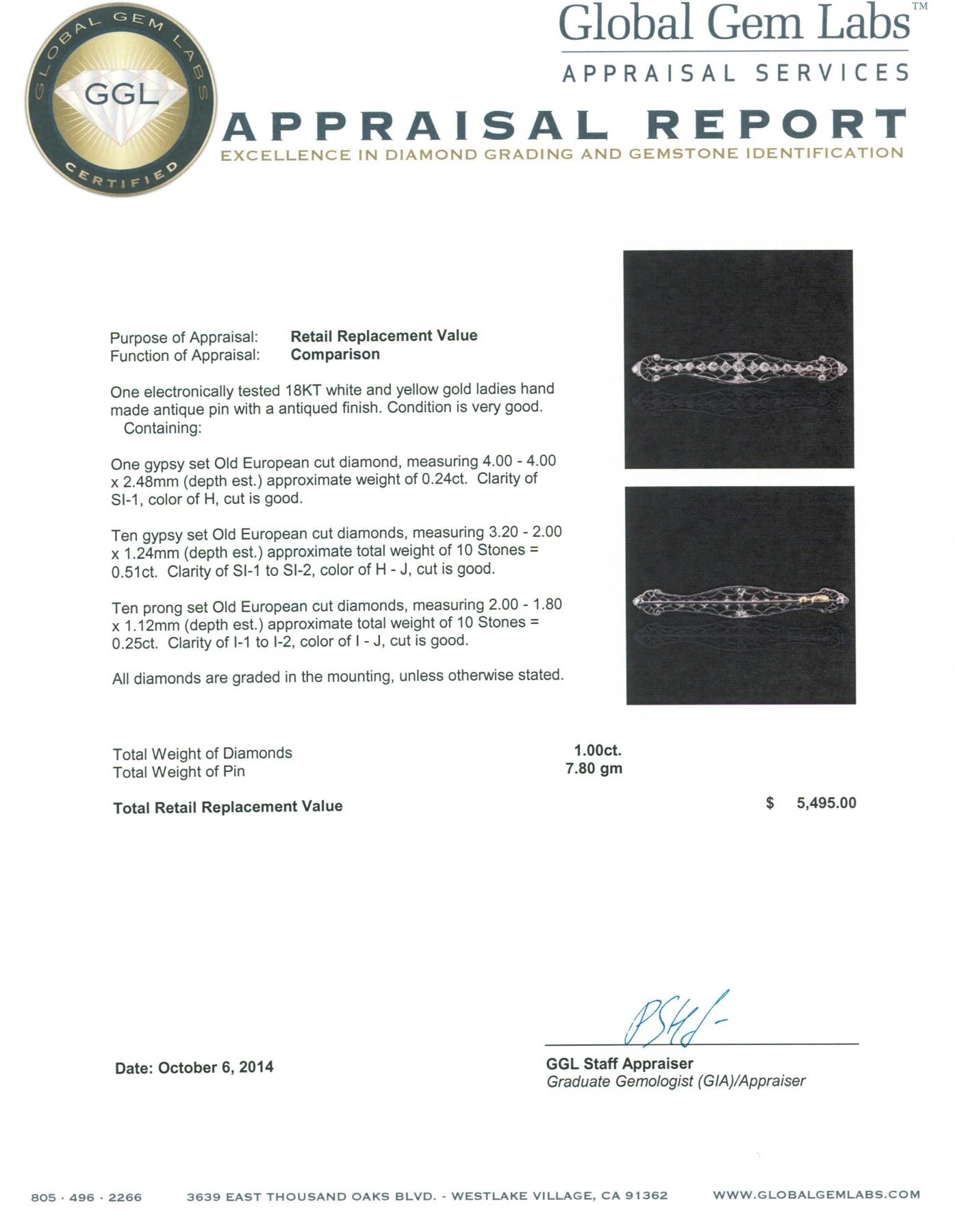 One electronically tested 18KT white and yellow gold ladies hand made antique pin with a antiqued finish. Condition is very good. Containing: One gypsy set Old European cut diamond, measuring 4.00 - 4.00 x 2.48mm (depth est.) approximate weight of 0.24ct. Clarity: SI-1. Color: H, Cut is Good. Ten gypsy set Old European cut diamonds, measuring 3.20 - 2.00 x 1.24mm (depth est.) approximate total weight of 10 Stones = 0.51ct. Clarity: SI-1 to SI-2. Color: H - J, Cut is Good. Ten prong set Old European cut diamonds, measuring 2.00 - 1.80 x 1.12mm (depth est.) approximate total weight of 10 Stones = 0.25ct. Clarity: I-1 to I-2. Color: I - J, Cut is Good. All diamonds are graded in the mounting, unless otherwise stated. Total Weight of Diamonds 1.00ct. Total Weight of Pin 7.80 grams. GGL Appraised.