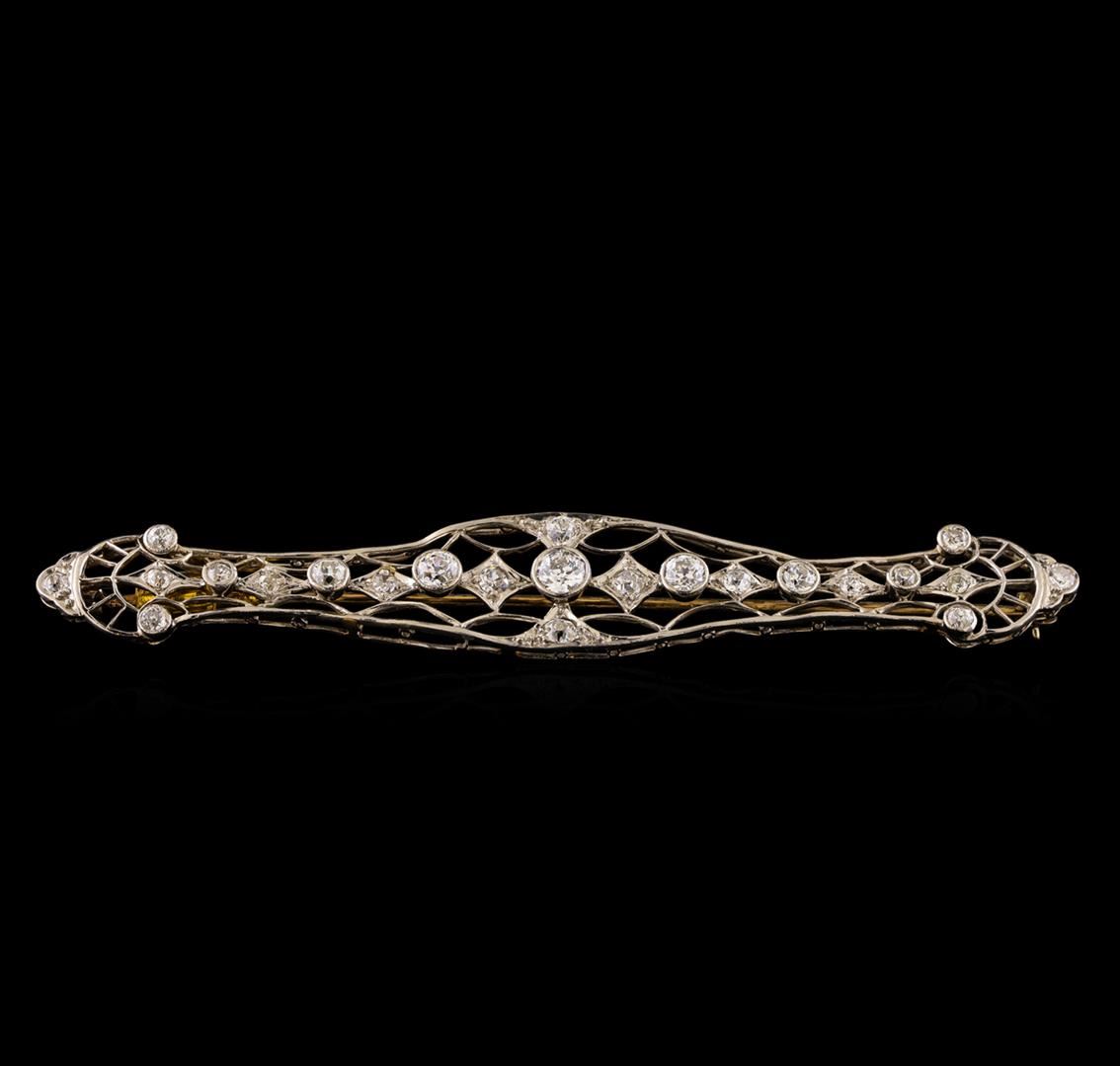 One electronically tested 18KT white and yellow gold ladies hand made antique pin with a antiqued finish. Condition is very good. Containing: One gypsy set Old European cut diamond, measuring 4.00 - 4.00 x 2.48mm (depth est.) approximate weight of 0.24ct. Clarity: SI-1. Color: H, Cut is Good. Ten gypsy set Old European cut diamonds, measuring 3.20 - 2.00 x 1.24mm (depth est.) approximate total weight of 10 Stones = 0.51ct. Clarity: SI-1 to SI-2. Color: H - J, Cut is Good. Ten prong set Old European cut diamonds, measuring 2.00 - 1.80 x 1.12mm (depth est.) approximate total weight of 10 Stones = 0.25ct. Clarity: I-1 to I-2. Color: I - J, Cut is Good. All diamonds are graded in the mounting, unless otherwise stated. Total Weight of Diamonds 1.00 ct. Total Weight of Pin 7.80 grams. GGL Appraised.