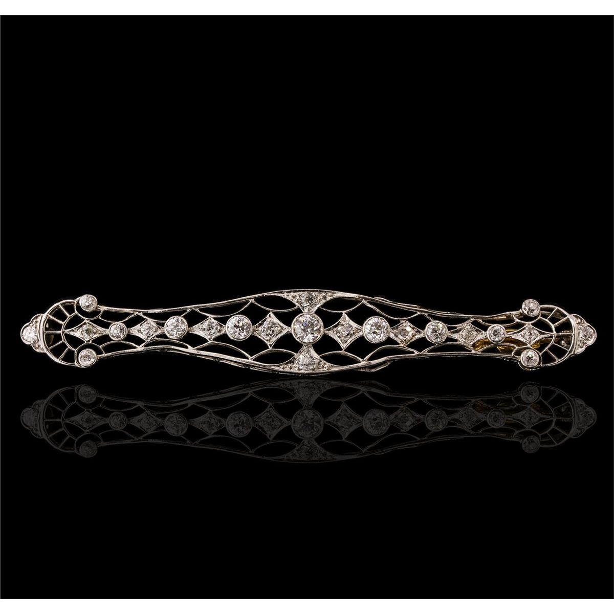 One electronically tested 18KT white and yellow gold ladies hand made antique pin with a antiqued finish. Condition is very good. Containing: One gypsy set Old European cut diamond, measuring 4.00 - 4.00 x 2.48mm (depth est.) approximate weight of 0.24ct. Clarity: SI-1. Color: H, Cut is Good. Ten gypsy set Old European cut diamonds, measuring 3.20 - 2.00 x 1.24mm (depth est.) approximate total weight of 10 Stones = 0.51ct. Clarity: SI-1 to SI-2. Color: H - J, Cut is Good. Ten prong set Old European cut diamonds, measuring 2.00 - 1.80 x 1.12mm (depth est.) approximate total weight of 10 Stones = 0.25ct. Clarity: I-1 to I-2. Color: I - J, Cut is Good. All diamonds are graded in the mounting, unless otherwise stated. Total Weight of Diamonds 1.00ct. Total Weight of Pin 7.80 grams. GGL Appraised at $5,495.00.