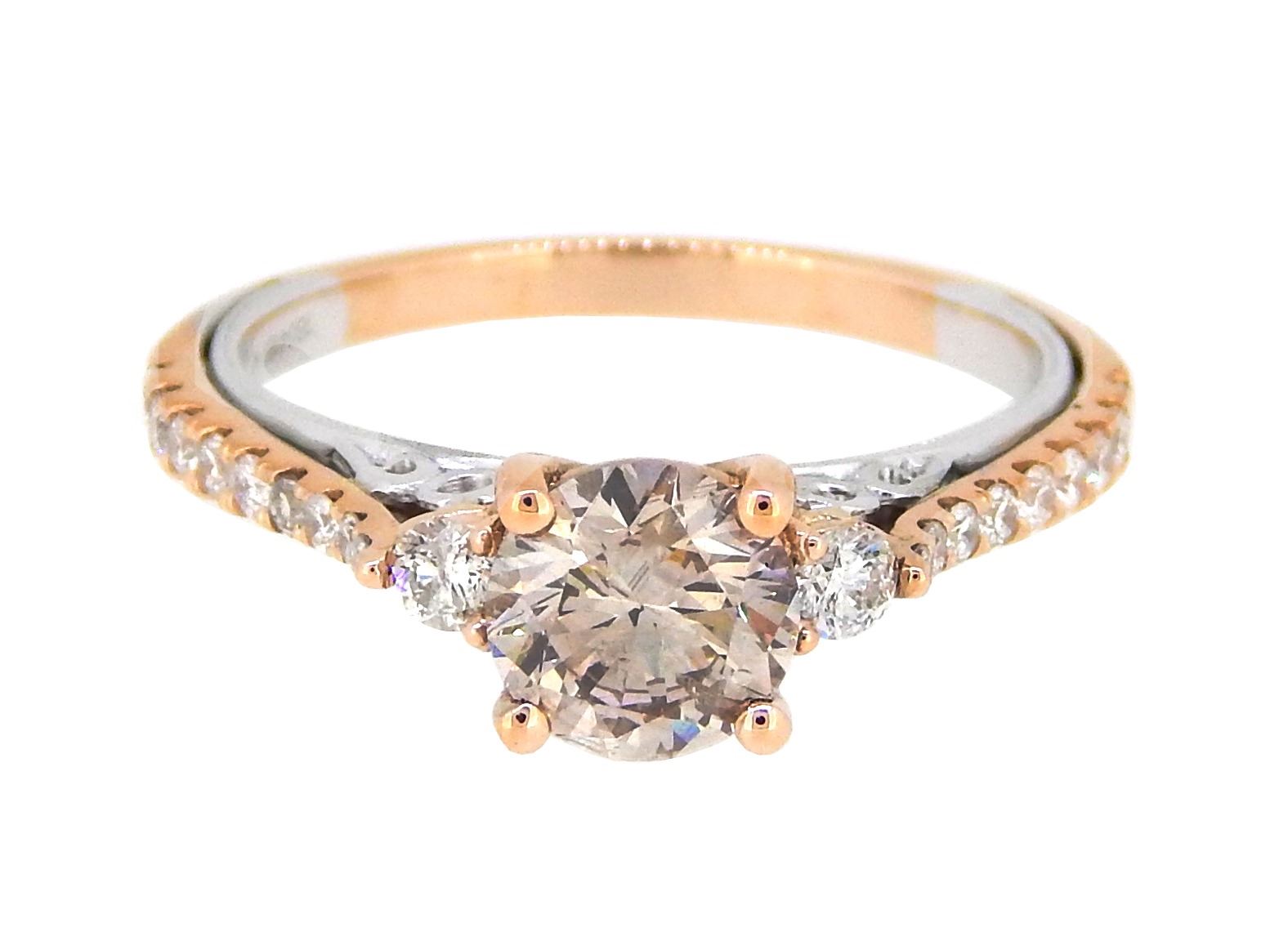 One 18KT Two Tone Gold 1.01ct Fancy Brown Diamond Ring. (1) Light Fancy Brown Diamond with a total weight of 1.01cts with a clarity of SI-2. (20) Round side Diamonds with a total weight of 0.35cts. Total weight of this ring is 3.1 grams.