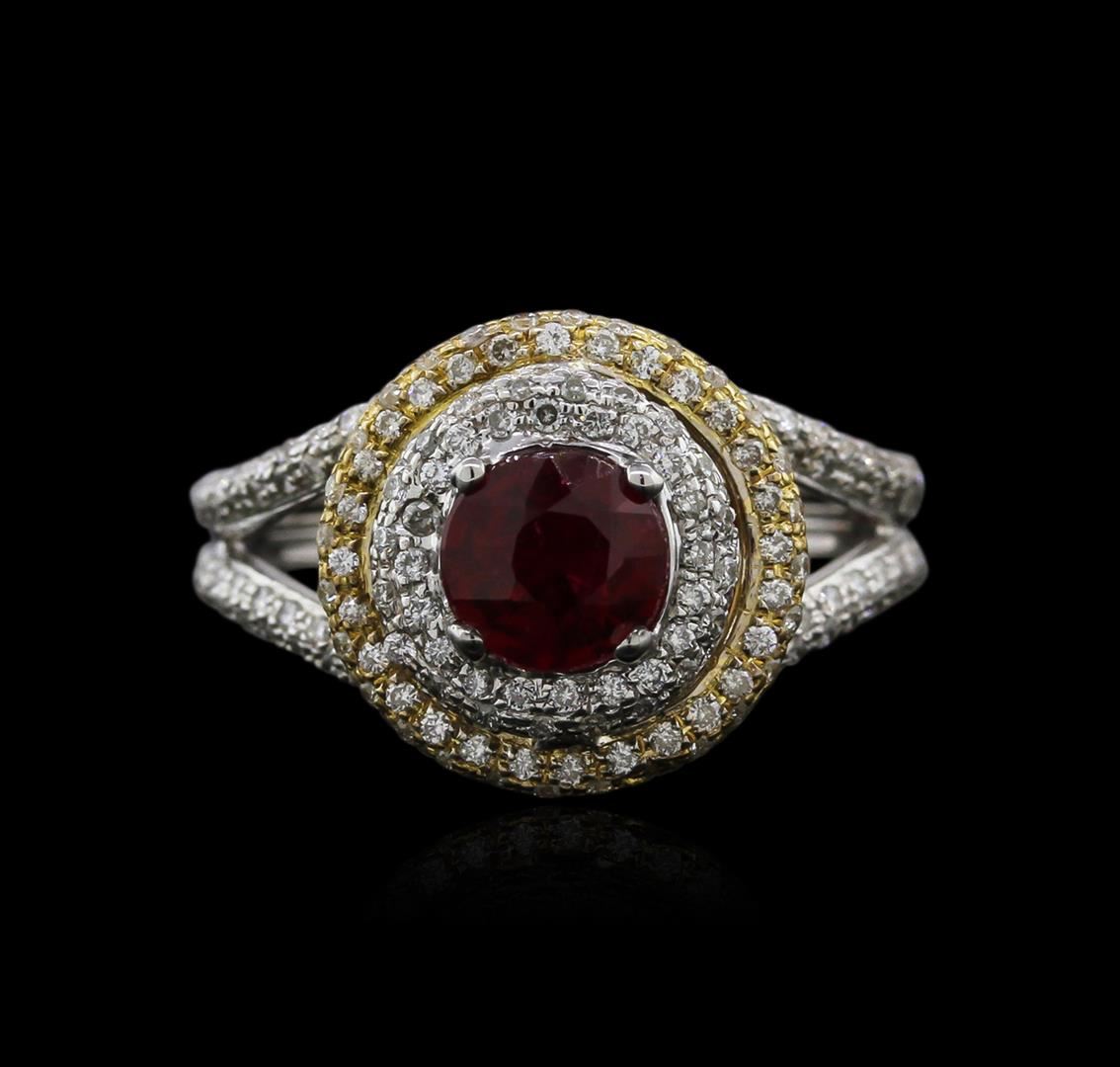One electronically tested 18KT white and yellow gold ladies cast ruby and diamond ring with a bright polish finish. Identified with markings of "750". Condition is new. Containing: One prong set round modified brilliant cut natural ruby, measuring 5.80 - 5.80 x 3.77 mm, approximate weight of 1.01ct., clarity is heavily included, type II, medium dark, moderately strong, strongly purplish red color, (GIA stpR 6/4), cut is good. Three Hundred Thirty-Three prong set round brilliant cut diamonds, measuring 1.00 - 1.00 x 0.60mm (depth est.) approximate. Total Weight of 333 Stones = 1.20ct. Clarity: SI-2 to I-2. Color: I - J, Cut is Good. Colored gemstones are presumed to have been subjected to commonly used enhancement processes. All diamonds and colored gemstones are graded in the mounting, unless otherwise stated. Total Weight of Colored Stones 1.01ct. Total Weight of Diamonds 1.20ct. Total Weight of Ring 6.60 grams. GGL Appraised at $3,880.00.