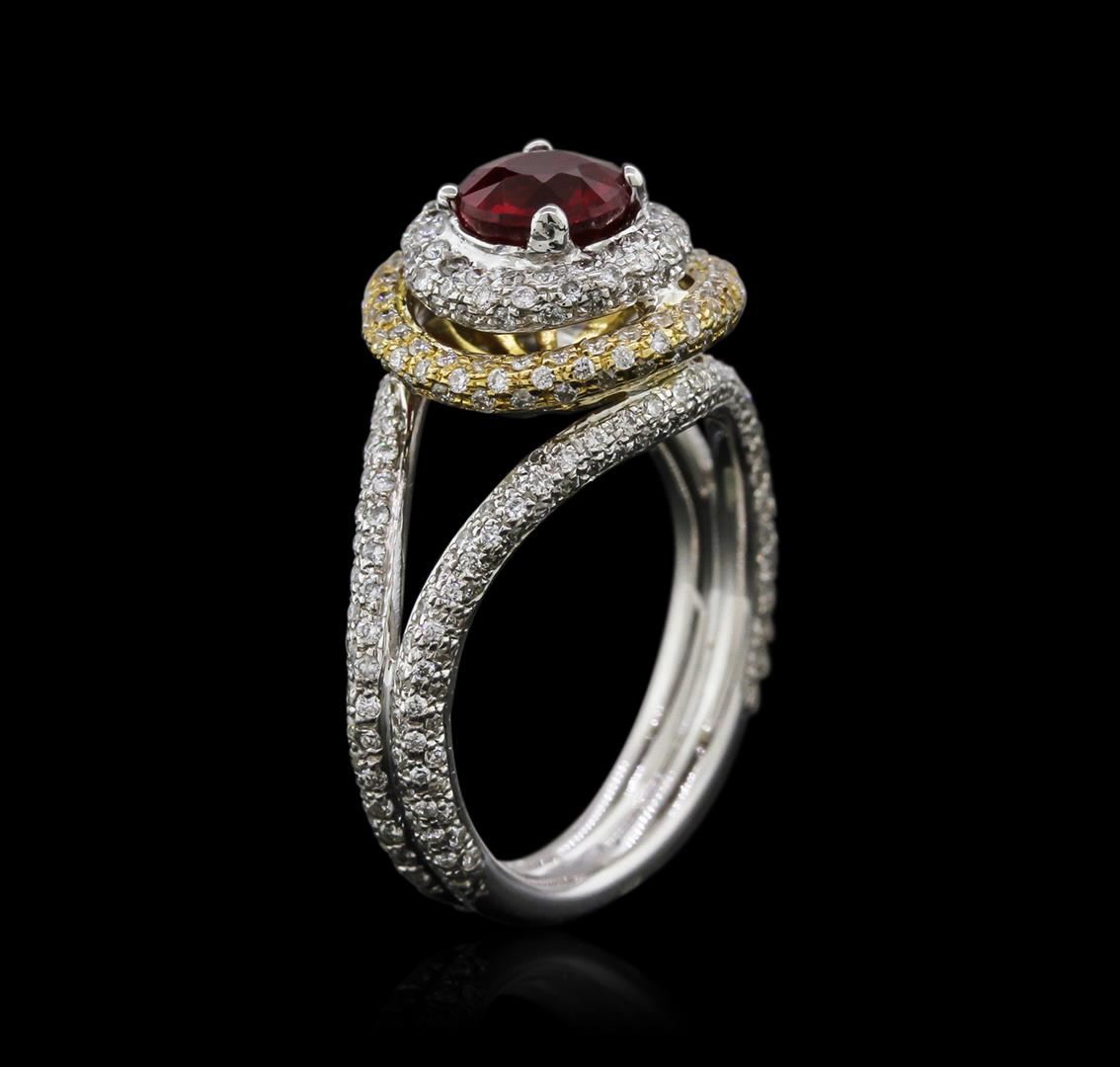 One electronically tested 18KT white and yellow gold ladies cast ruby and diamond ring with a bright polish finish. Identified with markings of "750". Condition is new. Containing: One prong set round modified brilliant cut natural ruby, measuring 5.80 - 5.80 x 3.77 mm, approximate weight of 1.01ct., clarity is heavily included, type II, medium dark, moderately strong, strongly purplish red color, (GIA stpR 6/4), cut is good. Three Hundred Thirty-Three prong set round brilliant cut diamonds, measuring 1.00 - 1.00 x 0.60mm (depth est.) approximate. Total Weight of 333 Stones = 1.20ct. Clarity: SI-2 to I-2. Color: I - J, Cut is Good. Colored gemstones are presumed to have been subjected to commonly used enhancement processes. All diamonds and colored gemstones are graded in the mounting, unless otherwise stated. Total Weight of Colored Stones 1.01ct. Total Weight of Diamonds 1.20ct. Total Weight of Ring 6.60 grams. GGL Appraised at $3,880.00.