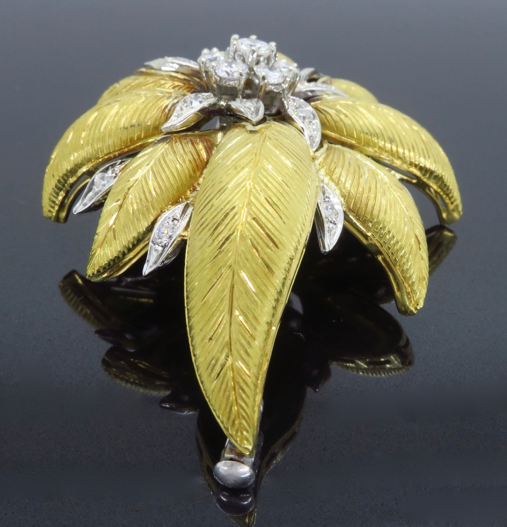 One 18KT Two Tone Gold 1.03ctw Diamond Brooch. (7) Round and (16) Single cut Diamonds with a total weight of 1.03cts with a color of G-I and clarity of VS-2 to SI-2. Total weight of this brooch is 23.1 grams. Total size of this brooch is 2 inches by 1.75 inches.