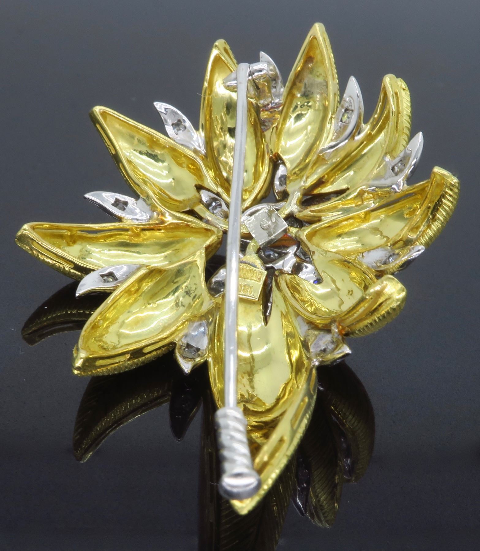 One 18KT Two Tone Gold 1.03ctw Diamond Brooch. (7) Round and (16) Single cut Diamonds with a total weight of 1.03cts with a color of G-I and clarity of VS-2 to SI-2. Total weight of this brooch is 23.1 grams. Total size of this brooch is 2 inches by 1.75 inches.
