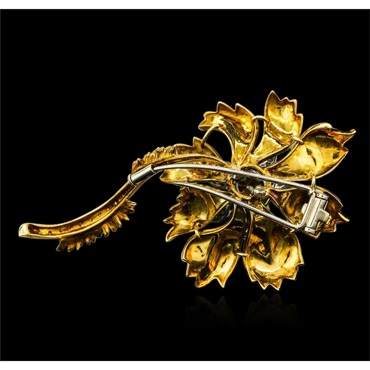 One electronically tested 18KT yellow and white gold ladies custom cast & assembled diamond and emerald flower brooch with a bright polish finish. The brooch features a stylized floral design. The center of the brooch features layers of diamonds and emeralds set within elaborate green and white enamel petals supported by a diamond set stem with fringed leaf accents, completed by a vertically placed pin. Area measurements 3.00 x 1.75 inches. Identified with markings of "18K". Condition is good. Containing: One prong set round brilliant cut diamond, measuring 4.45 - 4.40 x 2.66mm (depth est.) approximate weight of 0.35ct. Graded in the setting. Clarity: VS-1. Color: G Forty-Five prong set round brilliant cut diamonds, measuring 1.80 - 1.70 x 1.05mm (depth est.) approximate total weight of 45 Stones = 1.00ct. Graded in the setting. Clarity: VVS-1 to VVS-2 Color F - H Six prong set round mixed cut natural emeralds, measuring 3.60 - 3.50 x 2.31 mm, approximate total weight of 1.06ct., clarity is moderately included, type III, medium dark, moderately strong, very slightly bluish green color, (GIA vslbG 6/4), cut is good. Transmitting light somewhat diffusely, transparent to translucent. Naturally occurring internal & external characteristics are present. Color grade is an average for the group. Graded in the setting. Total Weight of Colored Stones 1.06ct. Total Weight of Diamonds 1.35ct. Total Weight of Brooch 31.13 grams. AIG Appraised at $15,690.00.