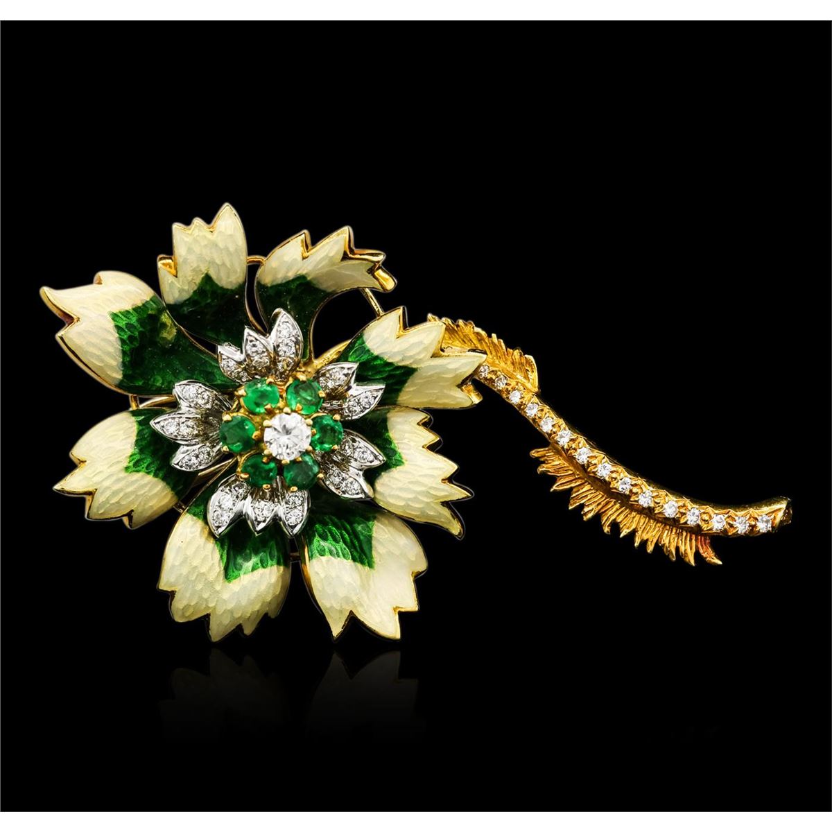 One electronically tested 18KT yellow and white gold ladies custom cast & assembled diamond and emerald flower brooch with a bright polish finish. The brooch features a stylized floral design. The center of the brooch features layers of diamonds and emeralds set within elaborate green and white enamel petals supported by a diamond set stem with fringed leaf accents, completed by a vertically placed pin. Area measurements 3.00 x 1.75 inches. Identified with markings of "18K". Condition is good. Containing: One prong set round brilliant cut diamond, measuring 4.45 - 4.40 x 2.66mm (depth est.) approximate weight of 0.35ct. Graded in the setting. Clarity: VS-1. Color: G Forty-Five prong set round brilliant cut diamonds, measuring 1.80 - 1.70 x 1.05mm (depth est.) approximate total weight of 45 Stones = 1.00ct. Graded in the setting. Clarity: VVS-1 to VVS-2 Color F - H Six prong set round mixed cut natural emeralds, measuring 3.60 - 3.50 x 2.31 mm, approximate total weight of 1.06ct., clarity is moderately included, type III, medium dark, moderately strong, very slightly bluish green color, (GIA vslbG 6/4), cut is good. Transmitting light somewhat diffusely, transparent to translucent. Naturally occurring internal & external characteristics are present. Color grade is an average for the group. Graded in the setting. Total Weight of Colored Stones 1.06ct. Total Weight of Diamonds 1.35ct. Total Weight of Brooch 31.13 grams. AIG Appraised at $15,690.00.