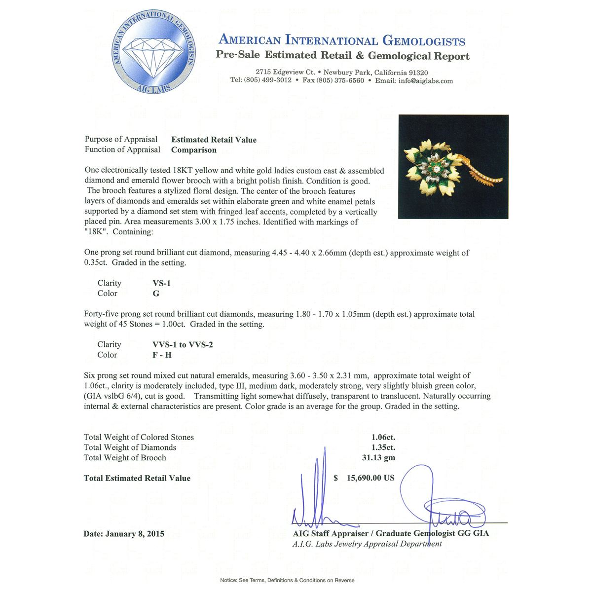 One electronically tested 18KT yellow and white gold ladies custom cast & assembled diamond and emerald flower brooch with a bright polish finish. The brooch features a stylized floral design. The center of the brooch features layers of diamonds and emeralds set within elaborate green and white enamel petals supported by a diamond set stem with fringed leaf accents, completed by a vertically placed pin. Area measurements 3.00 x 1.75 inches. Identified with markings of "18K". Condition is good. Containing: One prong set round brilliant cut diamond, measuring 4.45 - 4.40 x 2.66mm (depth est.) approximate weight of 0.35ct. Graded in the setting. Clarity: VS-1. Color: G Forty-Five prong set round brilliant cut diamonds, measuring 1.80 - 1.70 x 1.05mm (depth est.) approximate total weight of 45 Stones = 1.00ct. Graded in the setting. Clarity: VVS-1 to VVS-2 Color F - H Six prong set round mixed cut natural emeralds, measuring 3.60 - 3.50 x 2.31 mm, approximate total weight of 1.06ct., clarity is moderately included, type III, medium dark, moderately strong, very slightly bluish green color, (GIA vslbG 6/4), cut is good. Transmitting light somewhat diffusely, transparent to translucent. Naturally occurring internal & external characteristics are present. Color grade is an average for the group. Graded in the setting. Total Weight of Colored Stones 1.06ct. Total Weight of Diamonds 1.35ct. Total Weight of Brooch 31.13 grams. AIG Appraised at $15,690.00.