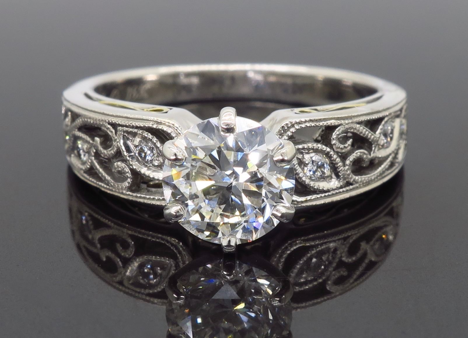 (1) GIA Certified Round Diamond with a total weight of 1.01cts with a color of G and clarity of SI-2. (6) round diamonds with a total weight of 0.06cts. Total weight of this ring is 4.6 grams. Ring size is 5.75.