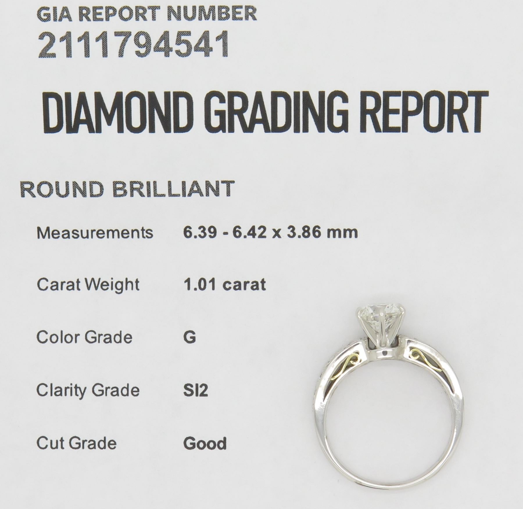 (1) GIA Certified Round Diamond with a total weight of 1.01cts with a color of G and clarity of SI-2. (6) round diamonds with a total weight of 0.06cts. Total weight of this ring is 4.6 grams. Ring size is 5.75.