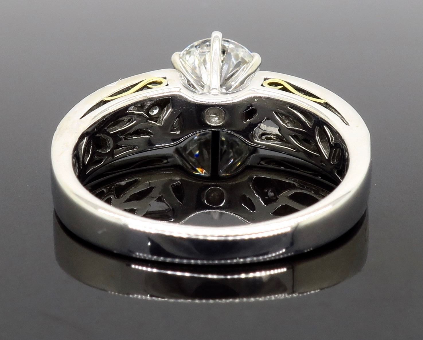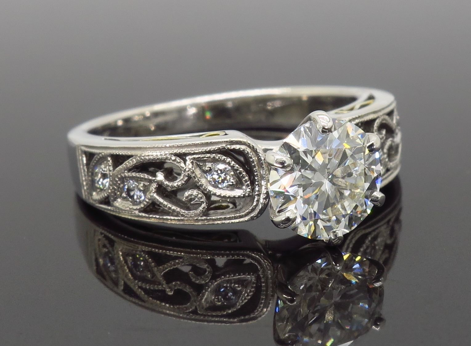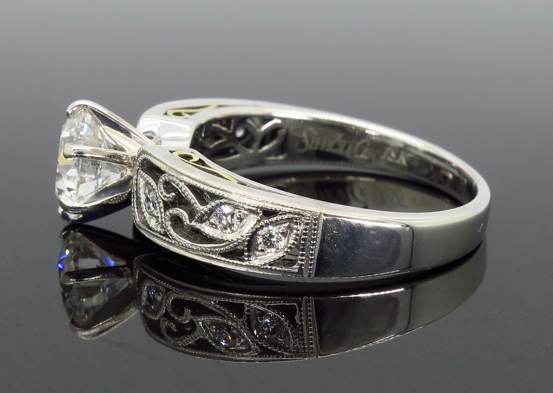 (1) GIA Certified Round Diamond with a total weight of 1.01cts with a color of G and clarity of SI-2. (6) round diamonds with a total weight of 0.06cts. Total weight of this ring is 4.6 grams. Ring size is 5.75.