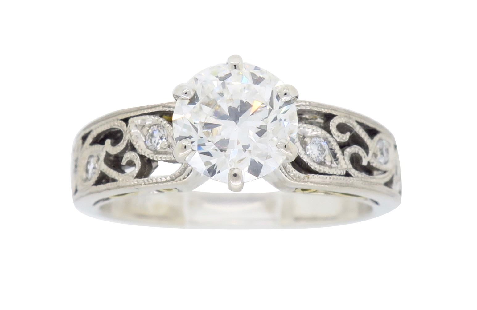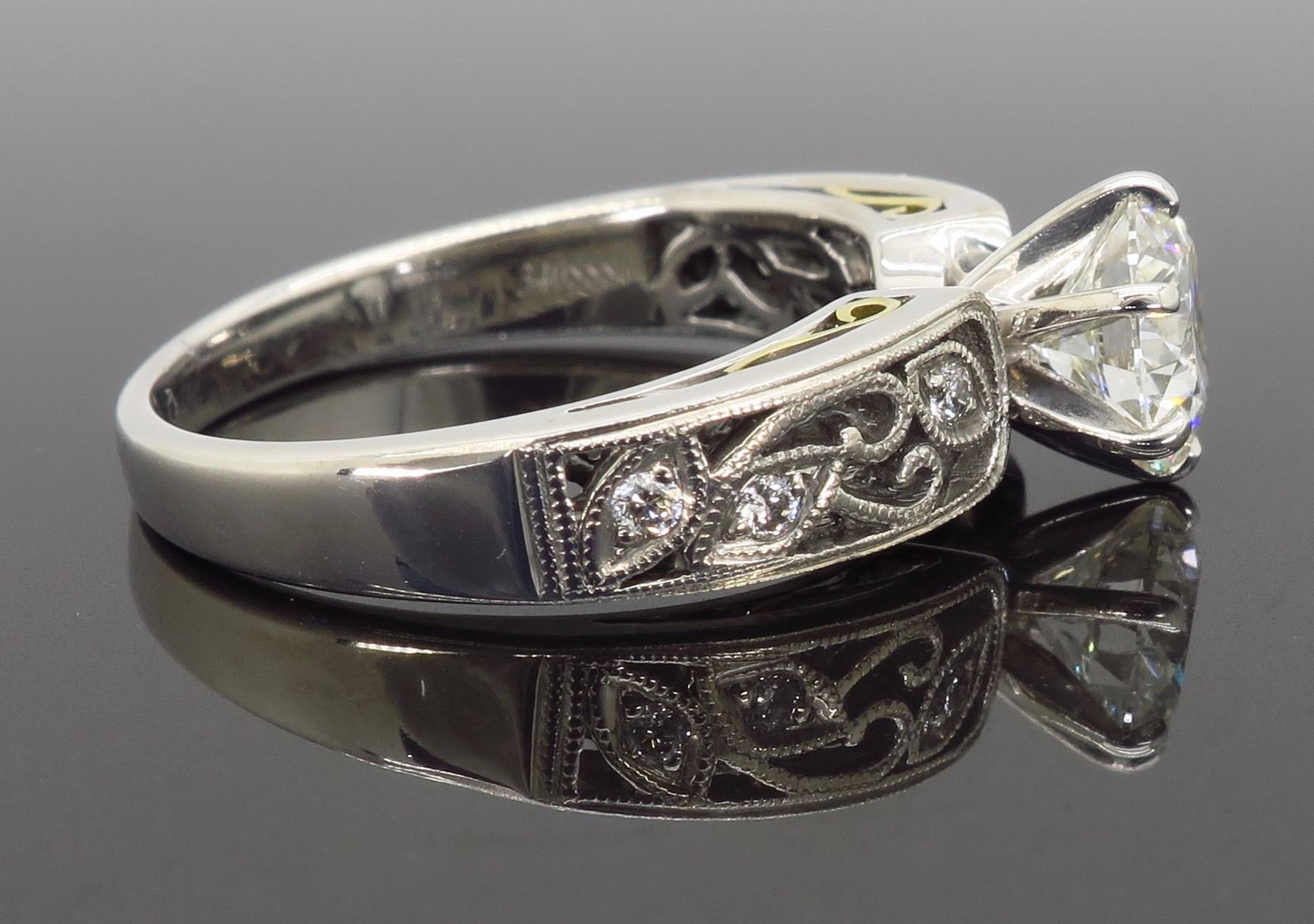 (1) GIA Certified Round Diamond with a total weight of 1.01cts with a color of G and clarity of SI-2. (6) round diamonds with a total weight of 0.06cts. Total weight of this ring is 4.6 grams. Ring size is 5.75.