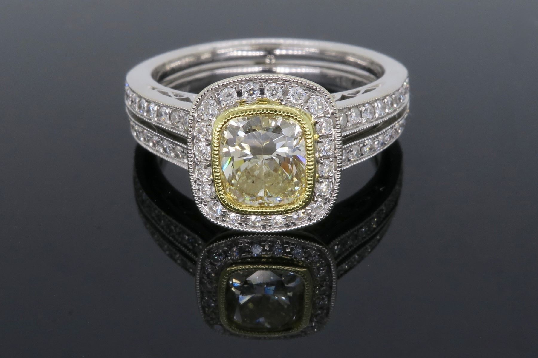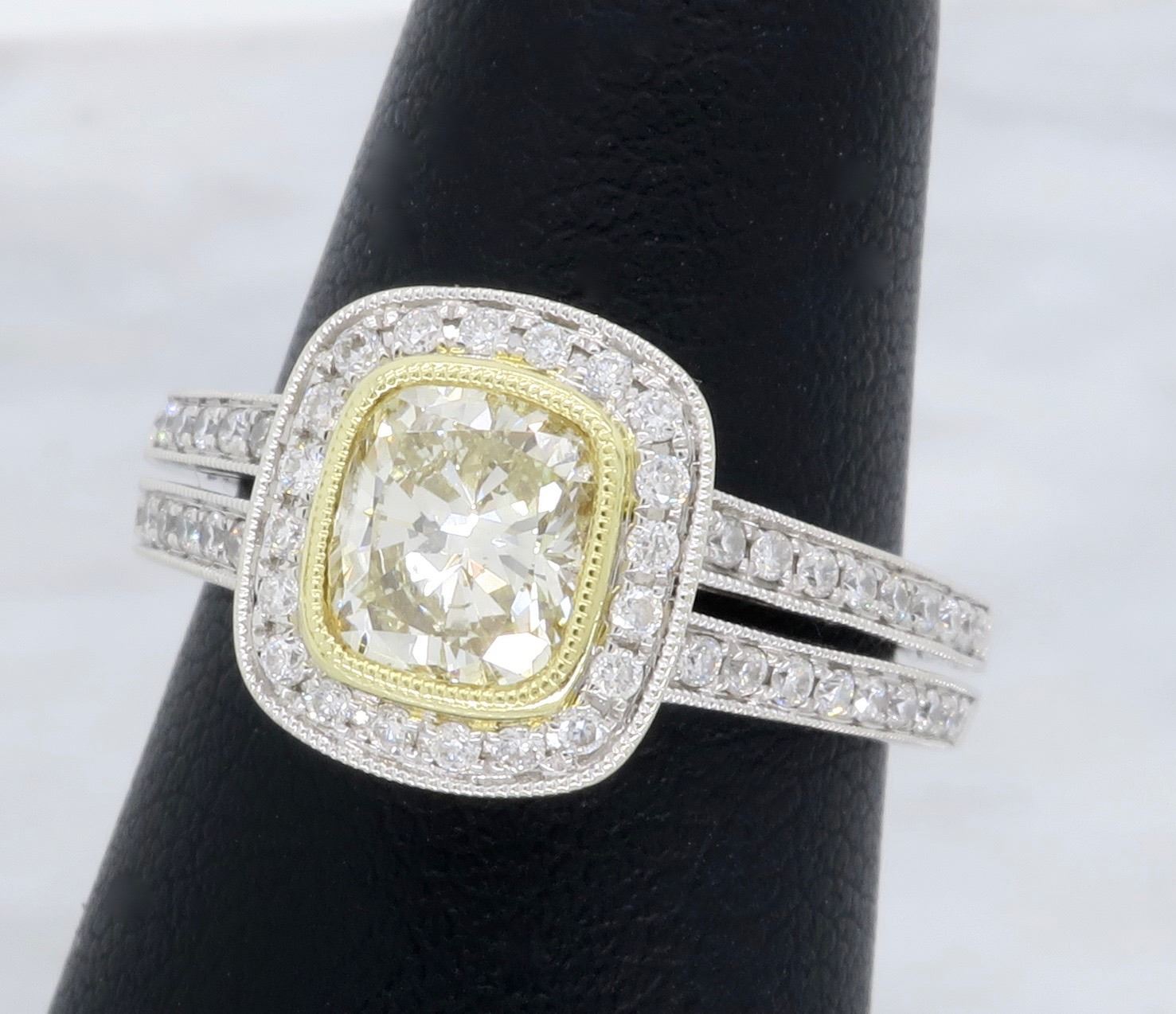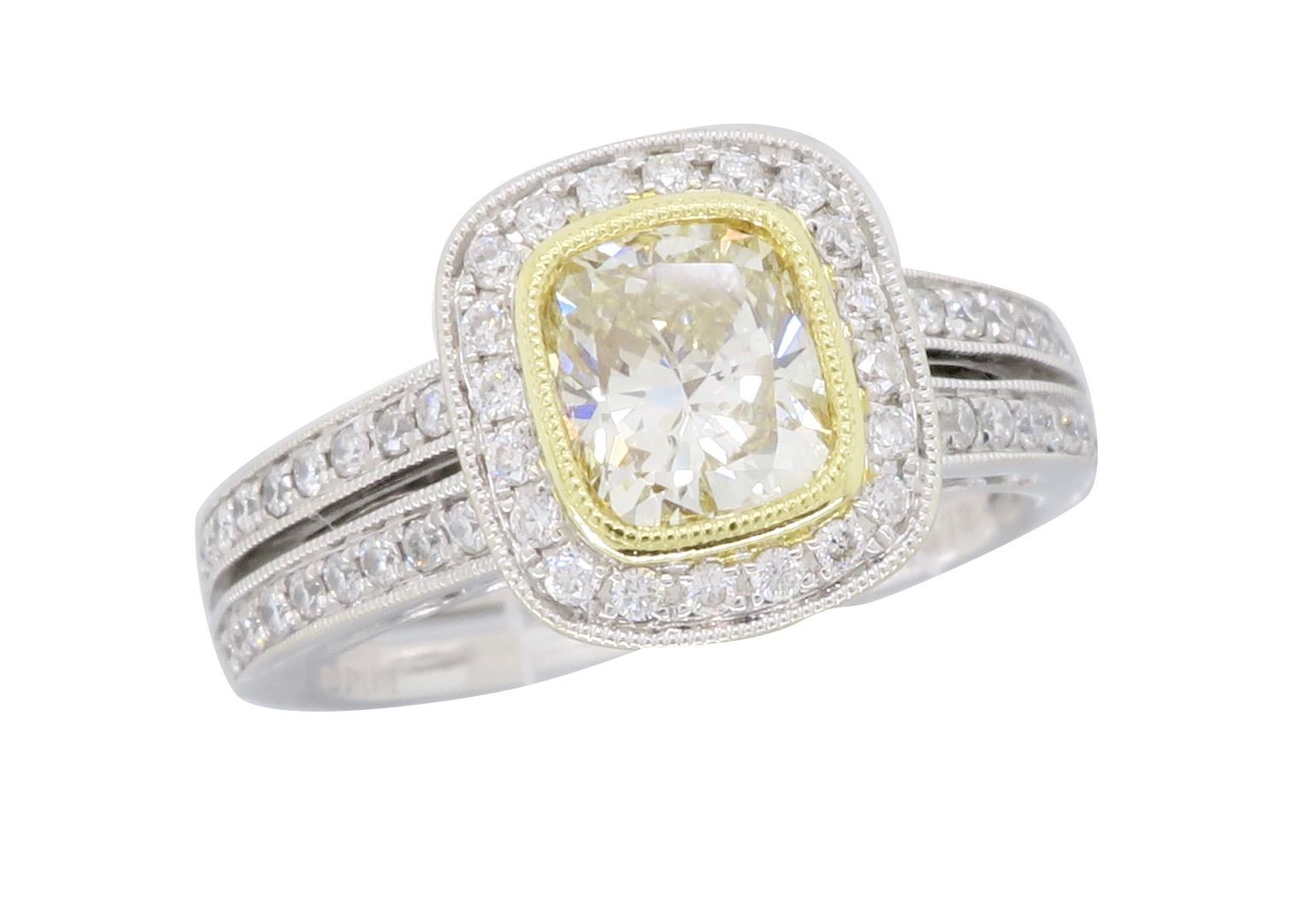 One 18KT Two Tone Gold 1.19ctw Diamond Ring. (1) Cushion cut Diamond with a total weight of 0.79cts with a color of Light Yellow and clarity of SI-2. Round side Diamonds with a total weight of 0.40cts. Total weight of this ring is 5.8 grams.