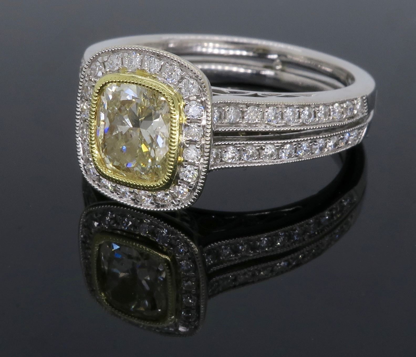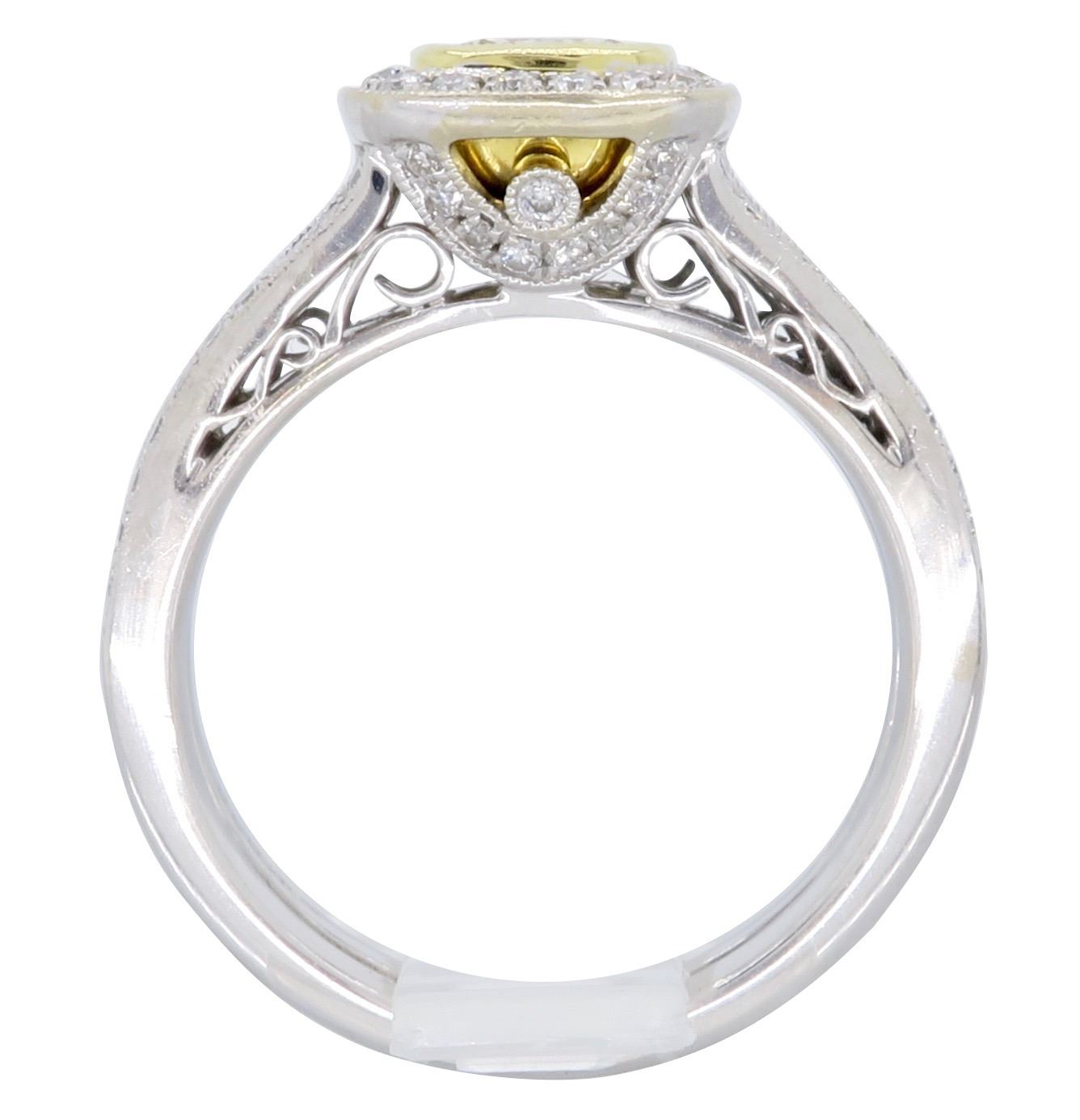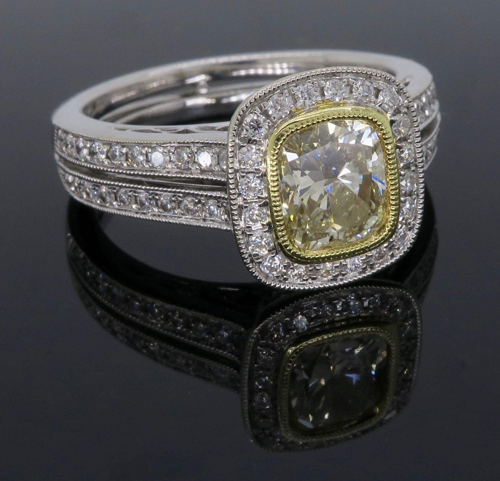 One 18KT Two Tone Gold 1.19ctw Diamond Ring. (1) Cushion cut Diamond with a total weight of 0.79cts with a color of Light Yellow and clarity of SI-2. Round side Diamonds with a total weight of 0.40cts. Total weight of this ring is 5.8 grams.