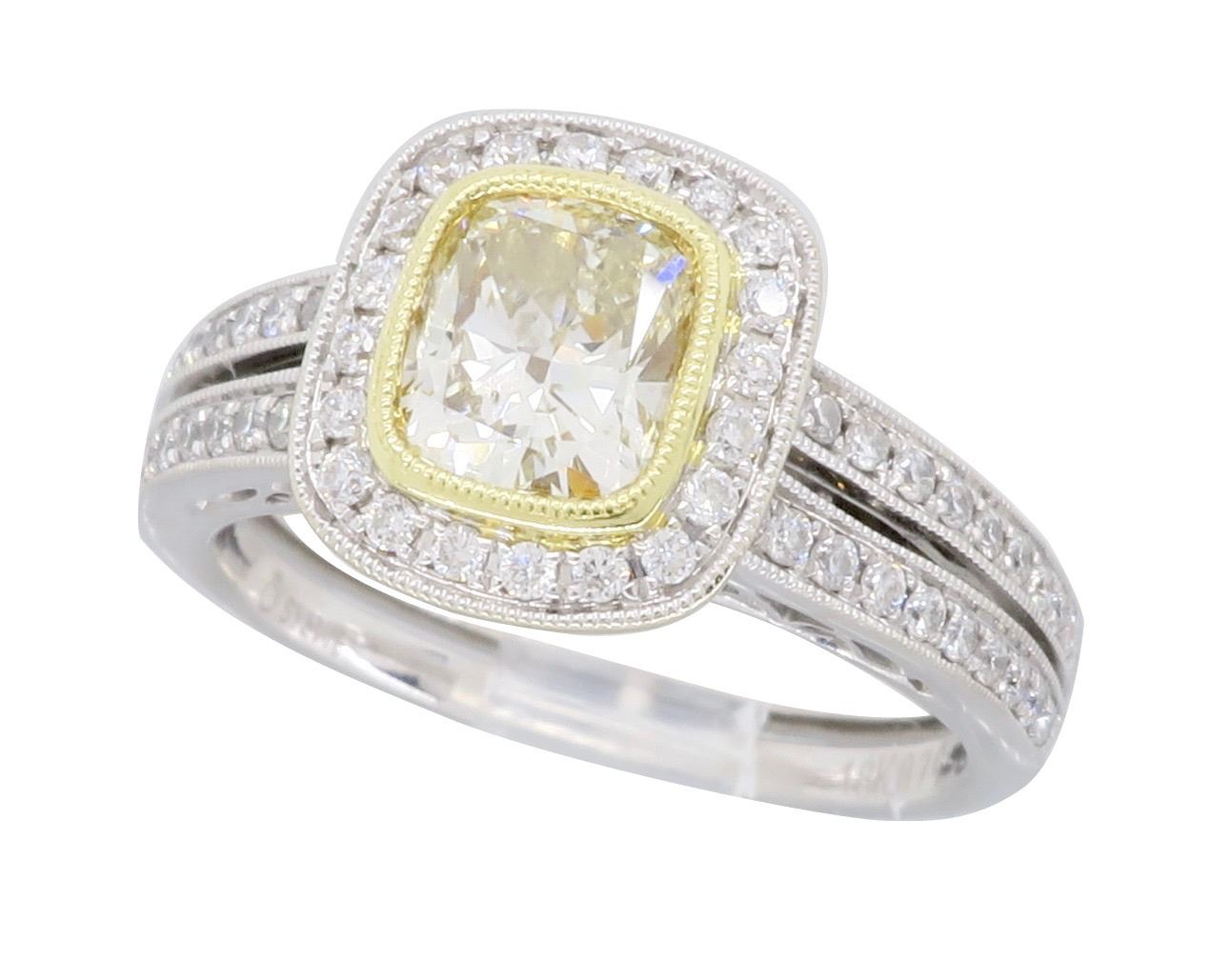 One 18KT Two Tone Gold 1.19ctw Diamond Ring. (1) Cushion cut Diamond with a total weight of 0.79cts with a color of Light Yellow and clarity of SI-2. Round side Diamonds with a total weight of 0.40cts. Total weight of this ring is 5.8 grams.