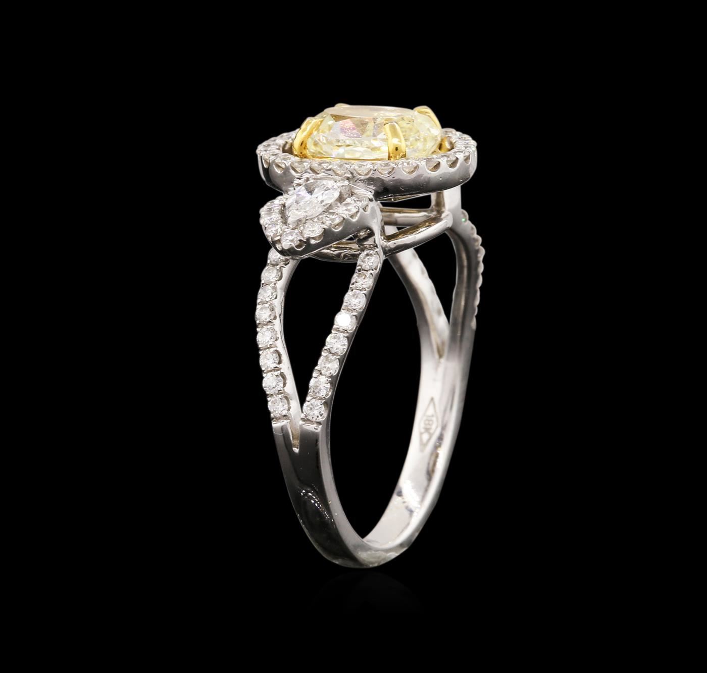 One electronically tested 18KT white and yellow gold ladies cast diamond engagement ring with a bright polish finish. Identified with markings of "18K". Condition is new. Containing: One bezel set oval shaped cut diamond, measuring 7.19 x 5.22 x 3.29mm (depth est.) approximate weight of 0.79ct. Clarity: VS-2, Cut is Good. Two prong set pear shaped cut diamonds, measuring 3.50 x 2.50 x 1.55mm (depth est.) approximate total weight of 2 Stones = 0.16ct. Clarity: SI-1. Color: H - I. Seventy-Six prong set round brilliant cut diamonds, measuring 1.00 - 1.00 x 0.60mm (depth est.) approximate total weight of 76 Stones = 0.27ct. Clarity: I-1. Color: I - J, Cut is Good. All diamonds are graded in the mounting, unless otherwise stated. Total Weight of Diamonds 1.22ct. Total Weight of Engagement Ring 4.50 grams. GGL Appraised at $6,350.00.