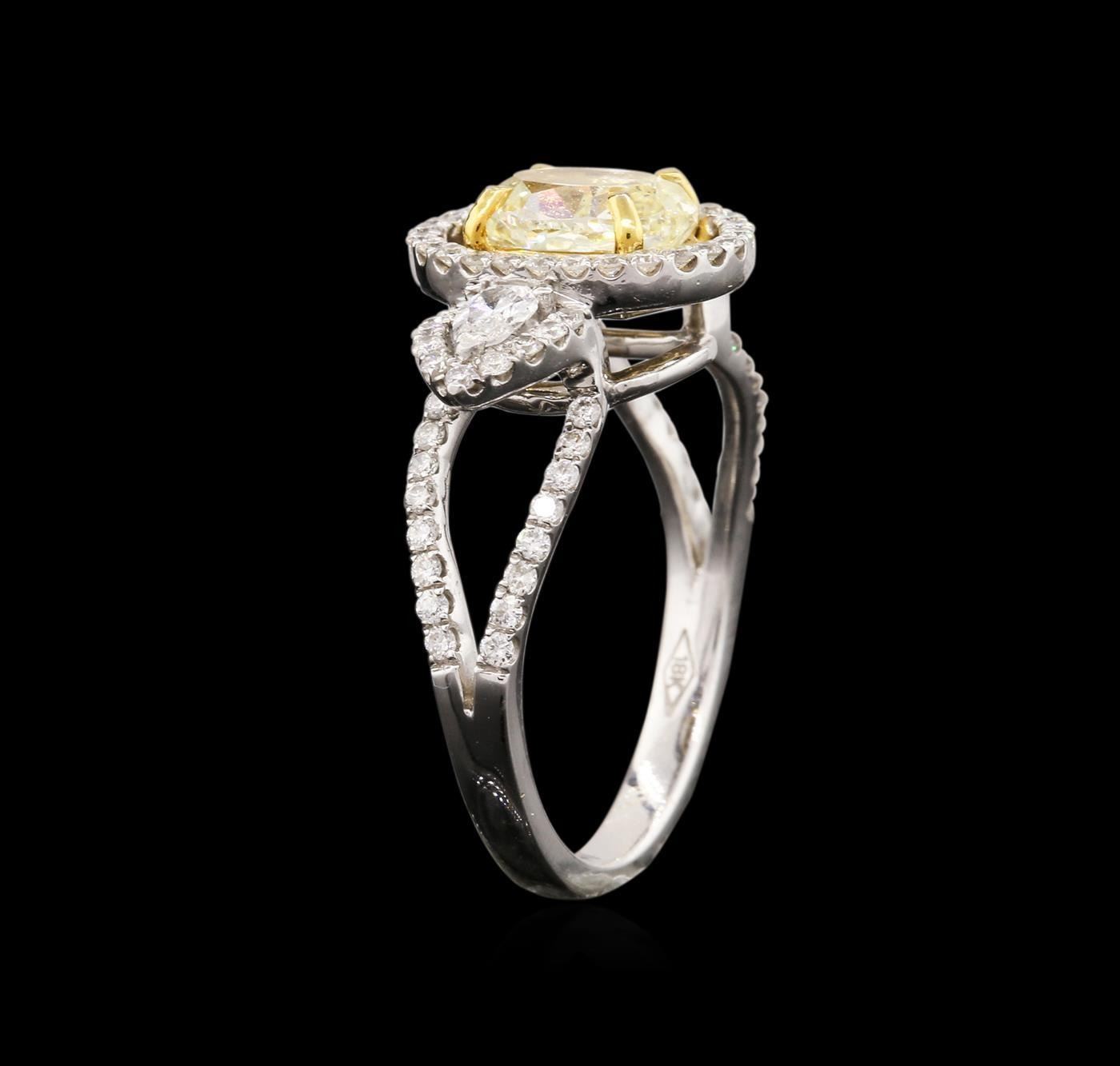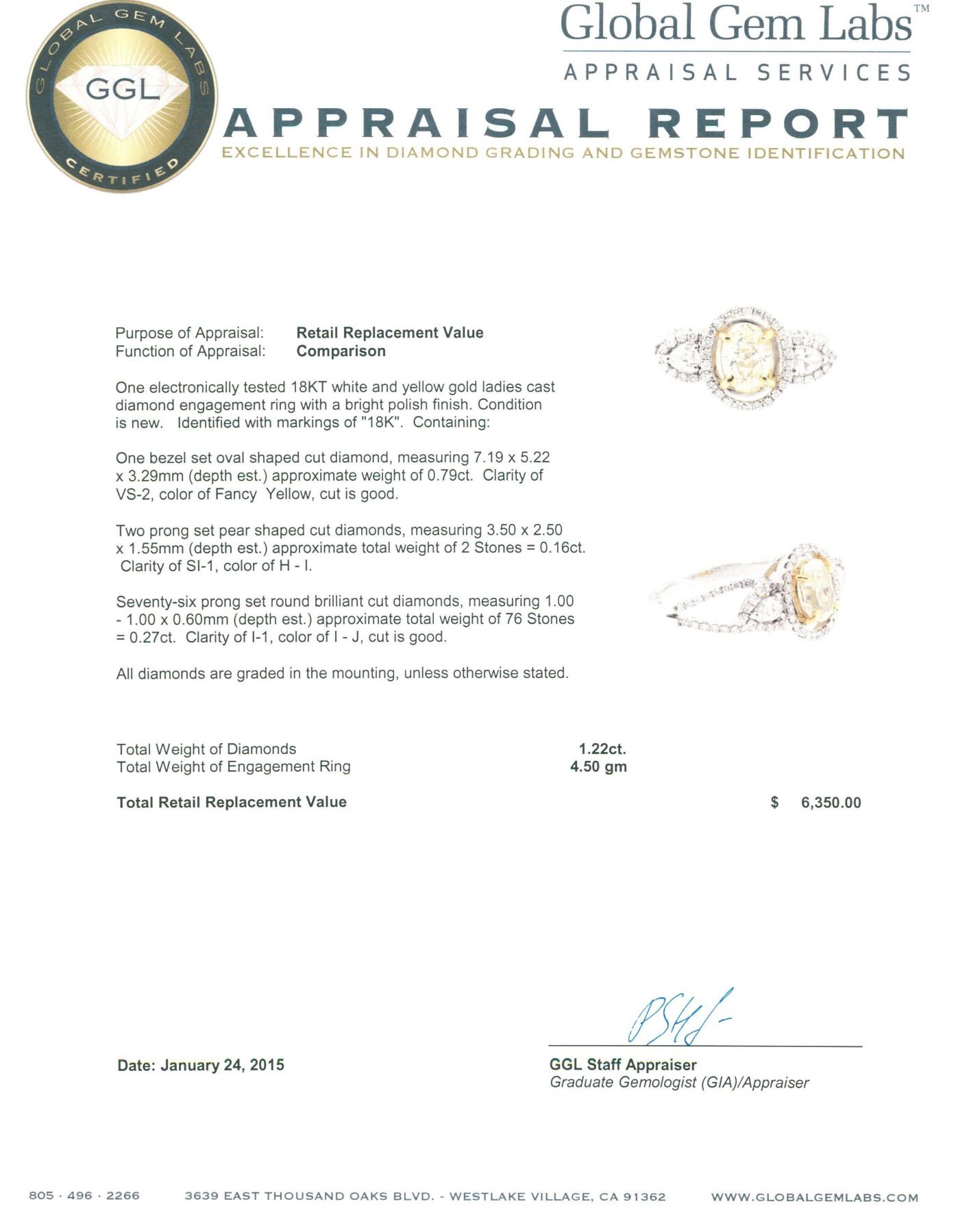 One electronically tested 18KT white and yellow gold ladies cast diamond engagement ring with a bright polish finish. Identified with markings of "18K". Condition is new. Containing: One bezel set oval shaped cut diamond, measuring 7.19 x 5.22 x 3.29mm (depth est.) approximate weight of 0.79ct. Clarity: VS-2, Cut is Good. Two prong set pear shaped cut diamonds, measuring 3.50 x 2.50 x 1.55mm (depth est.) approximate total weight of 2 Stones = 0.16ct. Clarity: SI-1. Color: H - I. Seventy-Six prong set round brilliant cut diamonds, measuring 1.00 - 1.00 x 0.60mm (depth est.) approximate total weight of 76 Stones = 0.27ct. Clarity: I-1. Color: I - J, Cut is Good. All diamonds are graded in the mounting, unless otherwise stated. Total Weight of Diamonds 1.22ct. Total Weight of Engagement Ring 4.50 grams. GGL Appraised.
