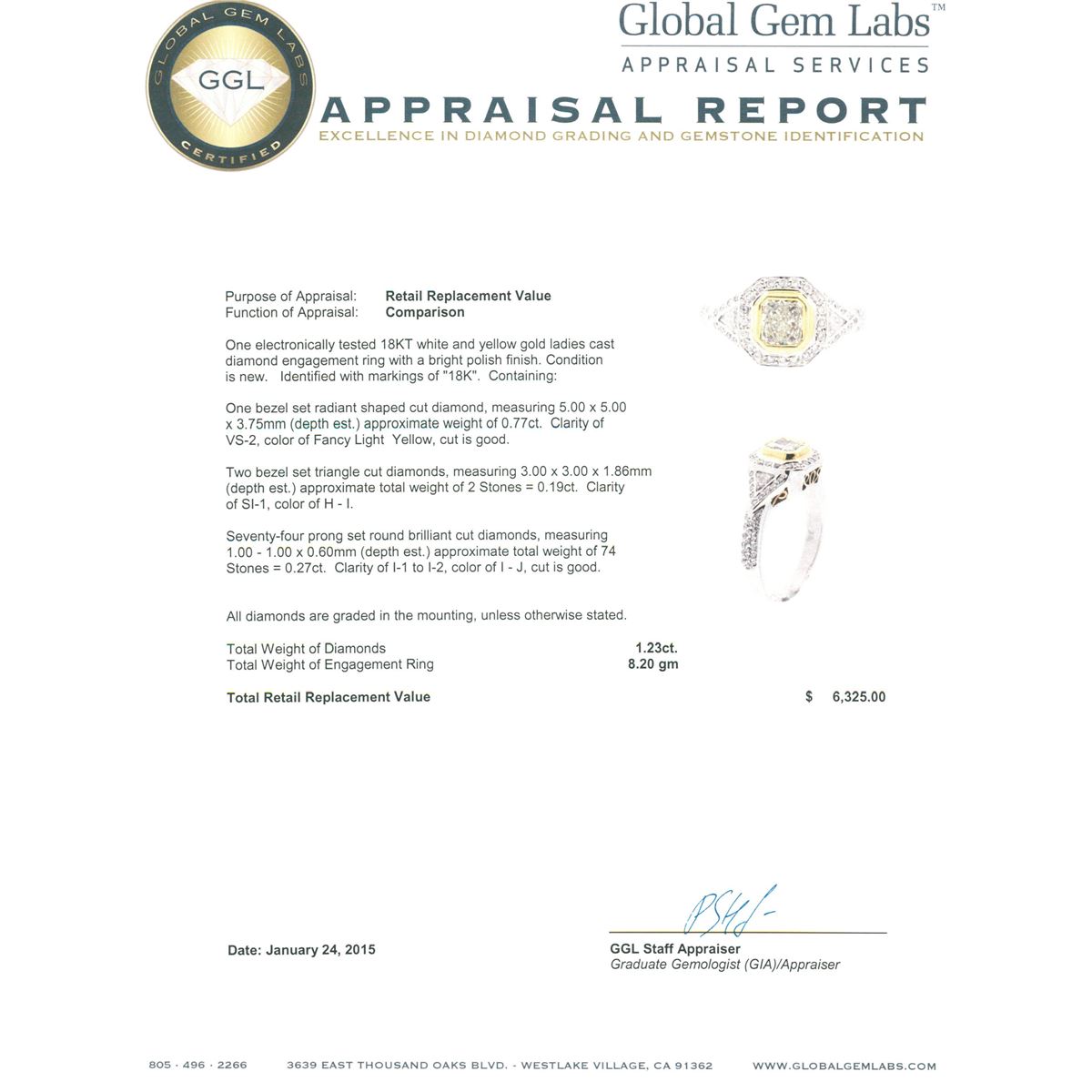 One electronically tested 18KT white and yellow gold ladies cast diamond engagement ring with a bright polish finish. Identified with markings of "18K". Condition is new. Containing: One bezel set radiant shaped cut diamond, measuring 5.00. x 5.00. x 3.75mm (depth est.) approximate weight of 0.77ct. Clarity: VS-2, Cut is Good. Two bezel set triangle cut diamonds, measuring 3.00. x 3.00. x 1.86mm (depth est.) approximate total weight of 2 Stones = 0.19ct. Clarity: SI-1. Color: H - I. Seventy-Four prong set round brilliant cut diamonds, measuring 1.00. - 1.00. x 0.60mm (depth est.) approximate total weight of 74 Stones = 0.27ct. Clarity: I-1 to I-2. Color: I - J, Cut is Good. All diamonds are graded in the mounting, unless otherwise stated. Total Weight of Diamonds 1.23ct. Total Weight of Engagement Ring 8.20 grams. GGL Appraised at $6,325.00.