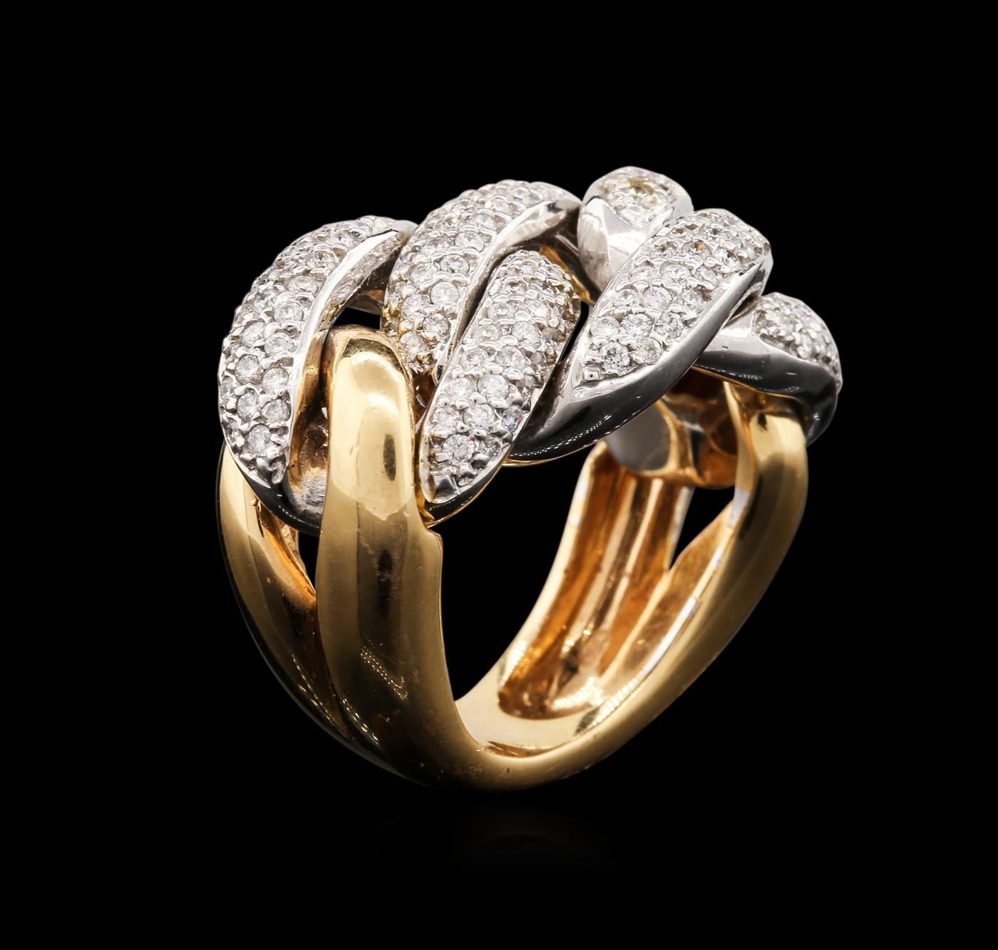 One electronically tested 18KT yellow and white gold ladies cast diamond ring with a bright polish finish. Identified with markings of "750". Condition is new. Containing: One Hundred Sixty-Eight prong set round brilliant cut diamonds, measuring 1.30 - 1.30 x 0.78mm (depth est.) approximate total weight of 168 Stones = 1.25ct. Clarity: I-1 to I-2. Color: I - J. All diamonds are graded in the mounting, unless otherwise stated. Total Weight of Diamonds 1.25ct. Total Weight of Ring 18.60 grams. GGL Appraised at $5,725.00.