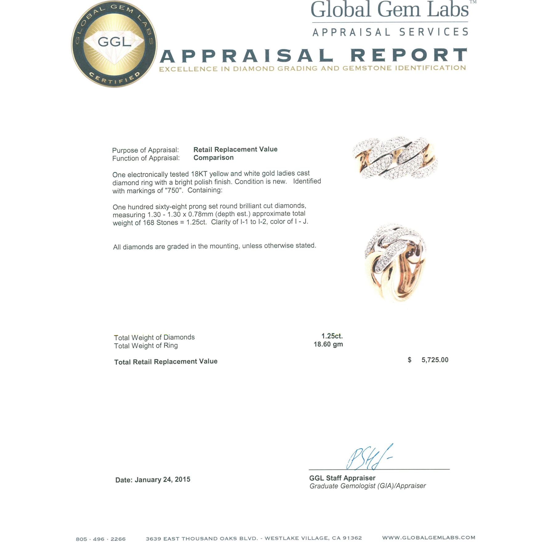 One electronically tested 18KT yellow and white gold ladies cast diamond ring with a bright polish finish. Identified with markings of "750". Condition is new. Containing: One Hundred Sixty-Eight prong set round brilliant cut diamonds, measuring 1.30 - 1.30 x 0.78mm (depth est.) approximate total weight of 168 Stones = 1.25ct. Clarity: I-1 to I-2. Color: I - J. All diamonds are graded in the mounting, unless otherwise stated. Total Weight of Diamonds 1.25ct. Total Weight of Ring 18.60 grams. GGL Appraised at $5,725.00.