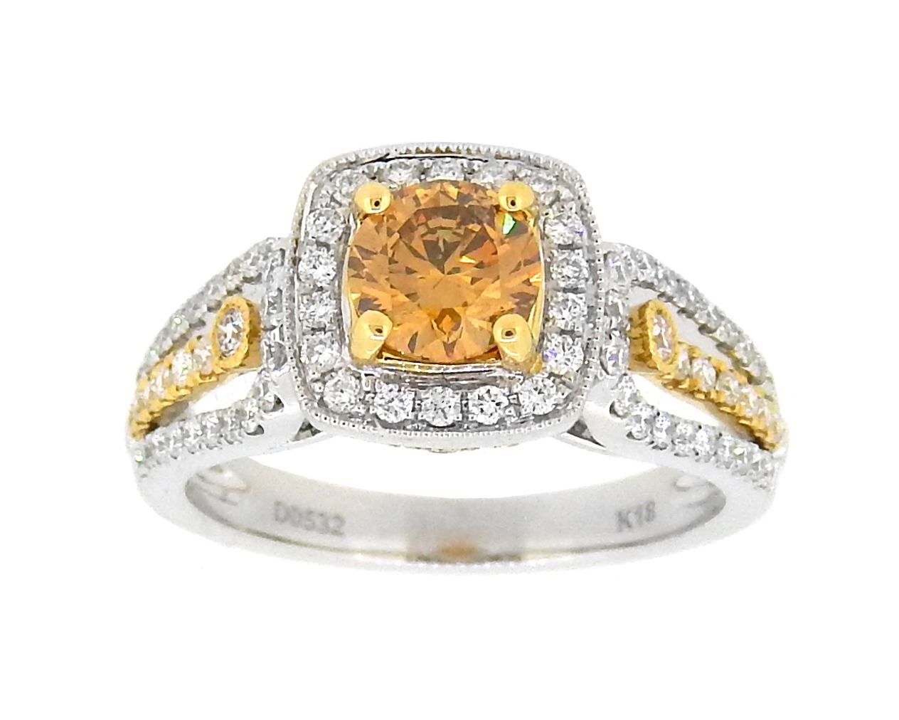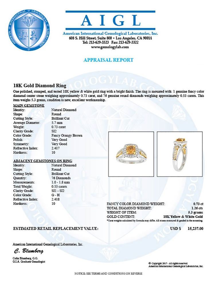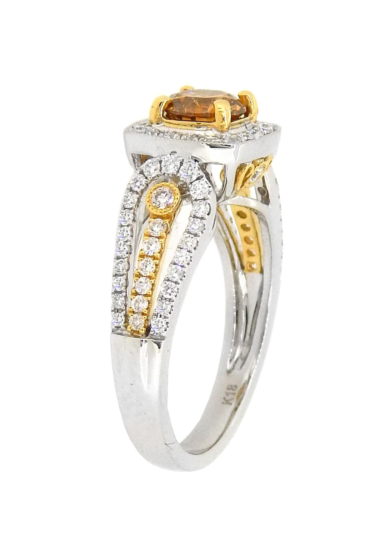 One 18KT Two Tone Gold 1.26ctw Fancy Orangy Brown Diamond Ring. (1) Fancy Orangy Brown center diamond with a total weight of 0.73cts. (76) Diamonds with a total weight of 0.53cts. Total weight of this ring is 5.3 grams.