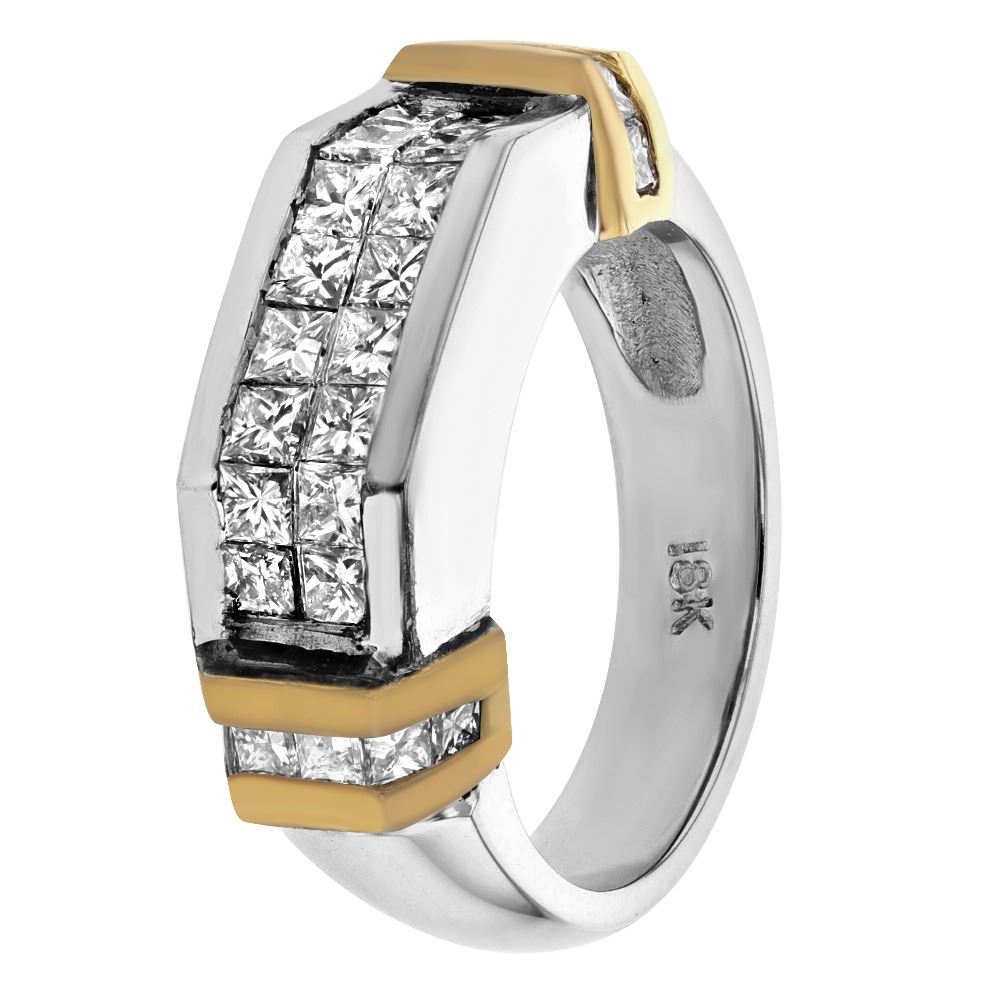 One 18KT Two Tone Gold 1.35ctw Diamond Ring. (26) Princess cut Diamonds with a total weight of 1.35cts with a color of I and clarity of I-2. Total weight of this ring is 9.62 grams.
