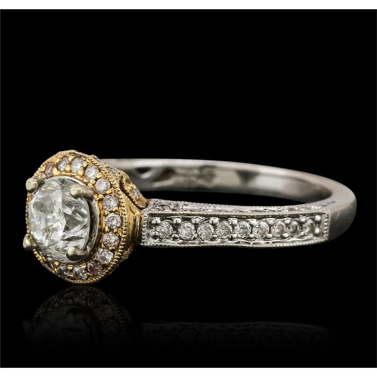 One electronically tested 18KT white and yellow gold ladies combination cast & assembled engagement ring with a flat shank with a bright polish finish. Identified with markings of "750". Condition is new. Containing: One prong set round brilliant cut diamond, measuring 5.80 - 5.80 x 3.48mm (depth est.) approximate weight of 0.71ct. Clarity: I-2. Color: J, Cut is Good. One Hundred Eight prong set round brilliant cut diamonds, measuring 1.30 - 1.10 x 0.72mm (depth est.) approximate total weight of 108 Stones = 0.68ct. Clarity: SI-2 to I-2. Color: I - J, Cut is Good. All diamonds are graded in the mounting, unless otherwise stated. Total Weight of Diamonds 1.39ct. Total Weight of Ring 5.10 grams. GGL Appraised at $7,150.00.