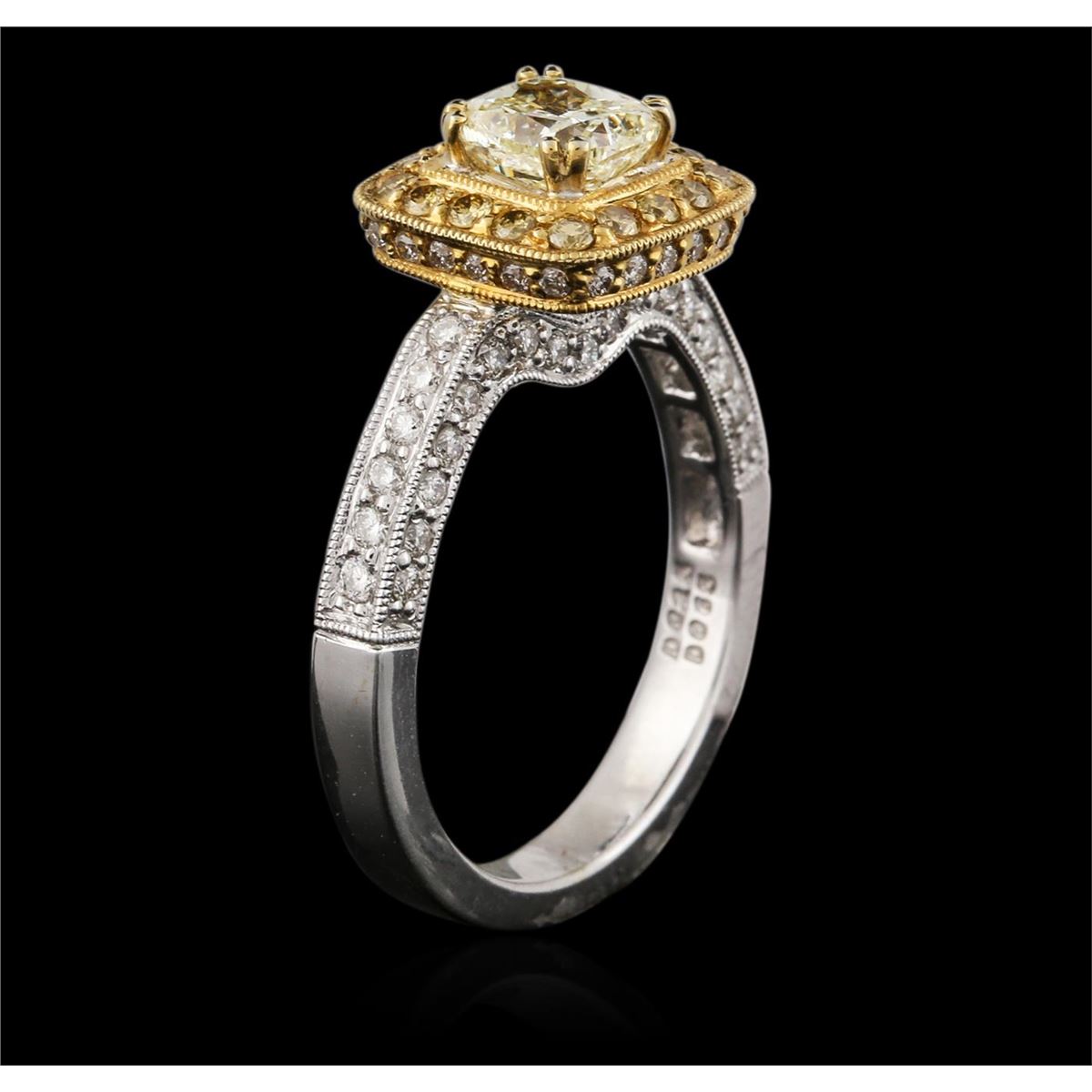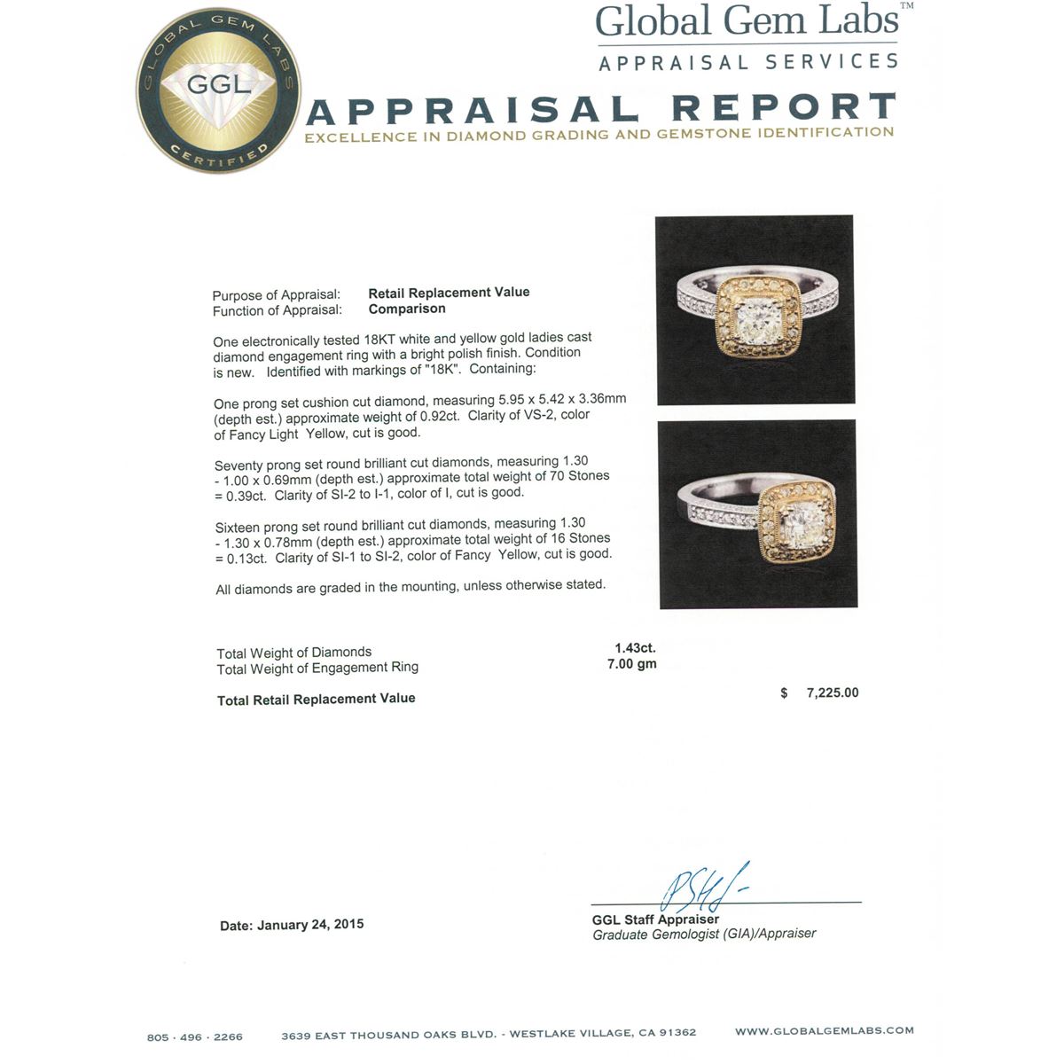 One electronically tested 18KT white and yellow gold ladies cast diamond engagement ring with a bright polish finish. Identified with markings of "18K". Condition is new. Containing: One prong set cushion cut diamond, measuring 5.95 x 5.42 x 3.36mm (depth est.) approximate weight of 0.92ct. Clarity: VS-2, Cut is Good. Seventy prong set round brilliant cut diamonds, measuring 1.30 - 1.00. x 0.69mm (depth est.) approximate total weight of 70 Stones = 0.39ct. Clarity: SI-2 to I-1. Color: I, Cut is Good. Sixteen prong set round brilliant cut diamonds, measuring 1.30 - 1.30 x 0.78mm (depth est.) approximate total weight of 16 Stones = 0.13ct. Clarity: SI-1 to SI-2, Cut is Good. All diamonds are graded in the mounting, unless otherwise stated. Total Weight of Diamonds 1.43ct. Total Weight of Engagement Ring 7.00. grams. GGL Appraised at $7,225.00.
