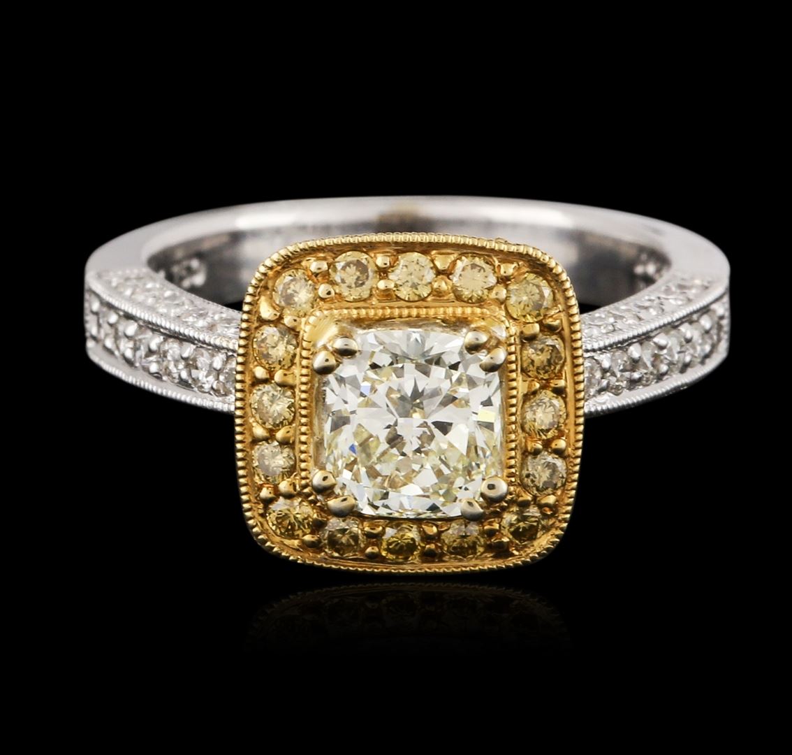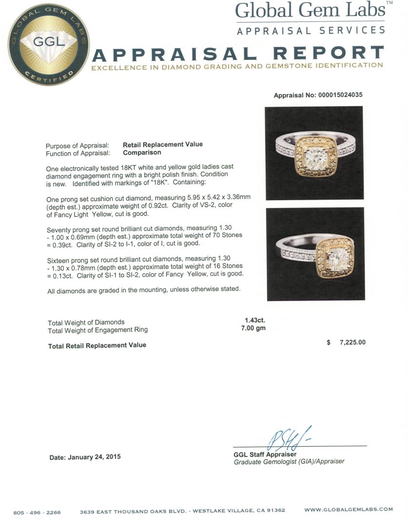 One electronically tested 18KT white and yellow gold ladies cast diamond engagement ring with a bright polish finish. Identified with markings of "18K". Condition is new. Containing: One prong set cushion cut diamond, measuring 5.95 x 5.42 x 3.36mm (depth est.) approximate weight of 0.92ct. Clarity: VS-2, Cut is Good. Seventy prong set round brilliant cut diamonds, measuring 1.30 - 1.00. x 0.69mm (depth est.) approximate total weight of 70 Stones = 0.39ct. Clarity: SI-2 to I-1. Color: I, Cut is Good. Sixteen prong set round brilliant cut diamonds, measuring 1.30 - 1.30 x 0.78mm (depth est.) approximate total weight of 16 Stones = 0.13ct. Clarity: SI-1 to SI-2, Cut is Good. All diamonds are graded in the mounting, unless otherwise stated. Total Weight of Diamonds 1.43ct. Total Weight of Engagement Ring 7.00. grams. GGL Appraised at $7,225.00.