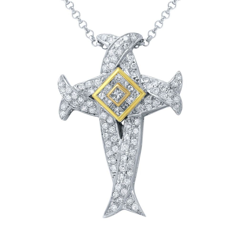 One 18KT Two Tone Gold 1.46ctw Diamond Pendant with Chain. (13) princess cut Diamonds with a total weight of 0.54cts with a color of I and clarity of I-1. (79) round Diamonds with a total weight of 0.92cts with a color of I and clarity of I-1. Total weight of this pendant with chain is 16.2 grams.