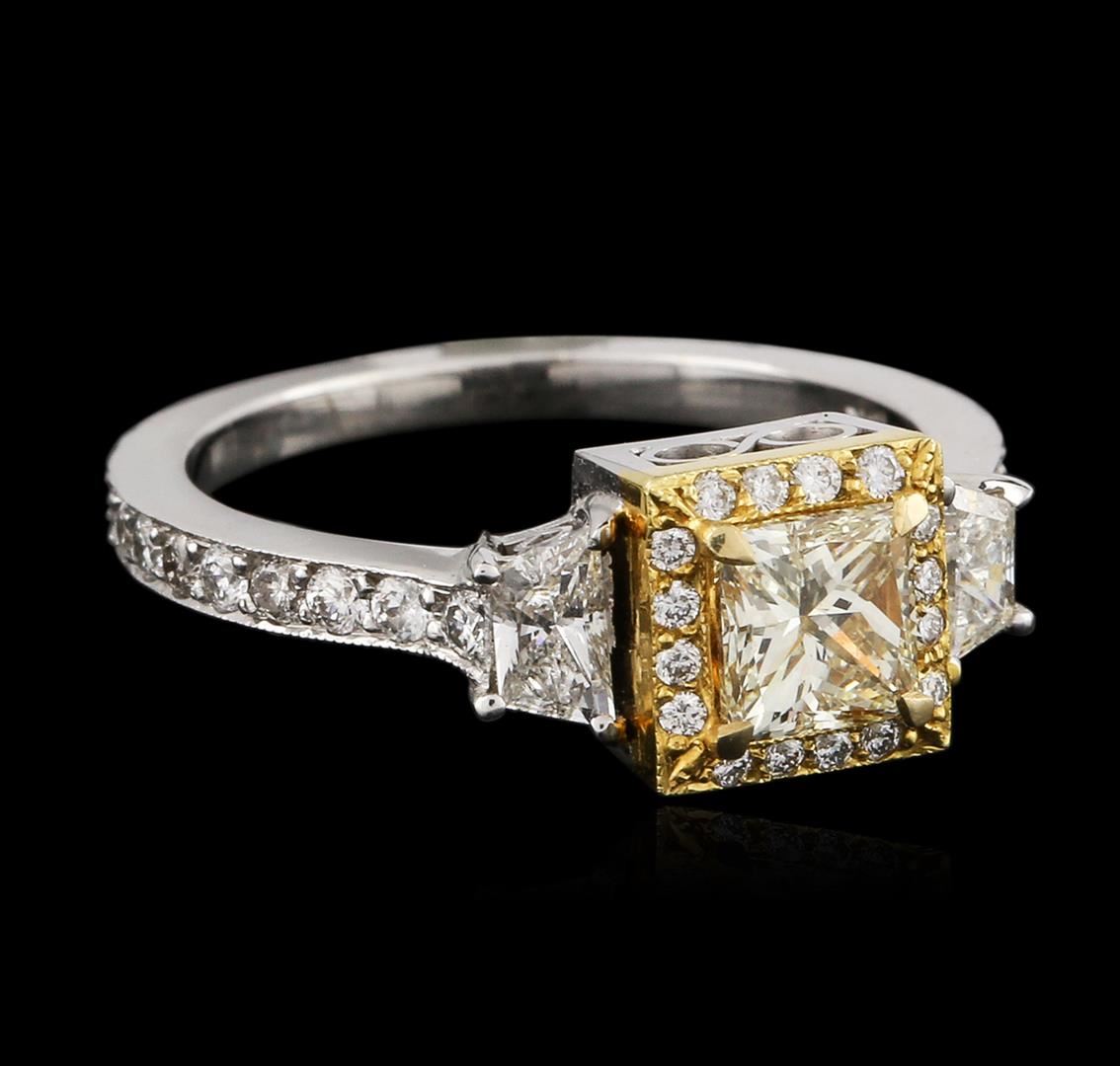 One electronically tested 18KT white and yellow gold ladies cast diamond engagement ring with a bright polish finish. Condition is new. Containing: One prong set princess cut diamond, measuring 5.00. x 5.00. x 3.75mm (depth est.) approximate weight of 0.77ct. Clarity: VS-2. Color: M, Cut is Good. Two prong set step trapezoid cut diamonds, measuring 3.50 x 2.30 x 0.00.mm (depth est.) approximate total weight of 2 Stones = 0.60ct. Clarity: SI-1. Color: H, Cut is Good. Thirty-Eight prong set round brilliant cut diamonds, measuring 1.50 - 1.50 x 0.90mm (depth est.) approximate total weight of 38 Stones = 0.47ct. Clarity: SI-1. Color: I - J, Cut is Good. All diamonds are graded in the mounting, unless otherwise stated. Total Weight of Diamonds 1.84ct. Total Weight of Engagement Ring 4.00. grams. GGL Appraised at $6,035.00.