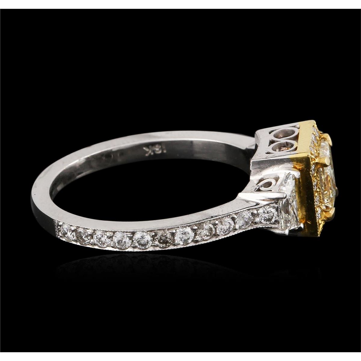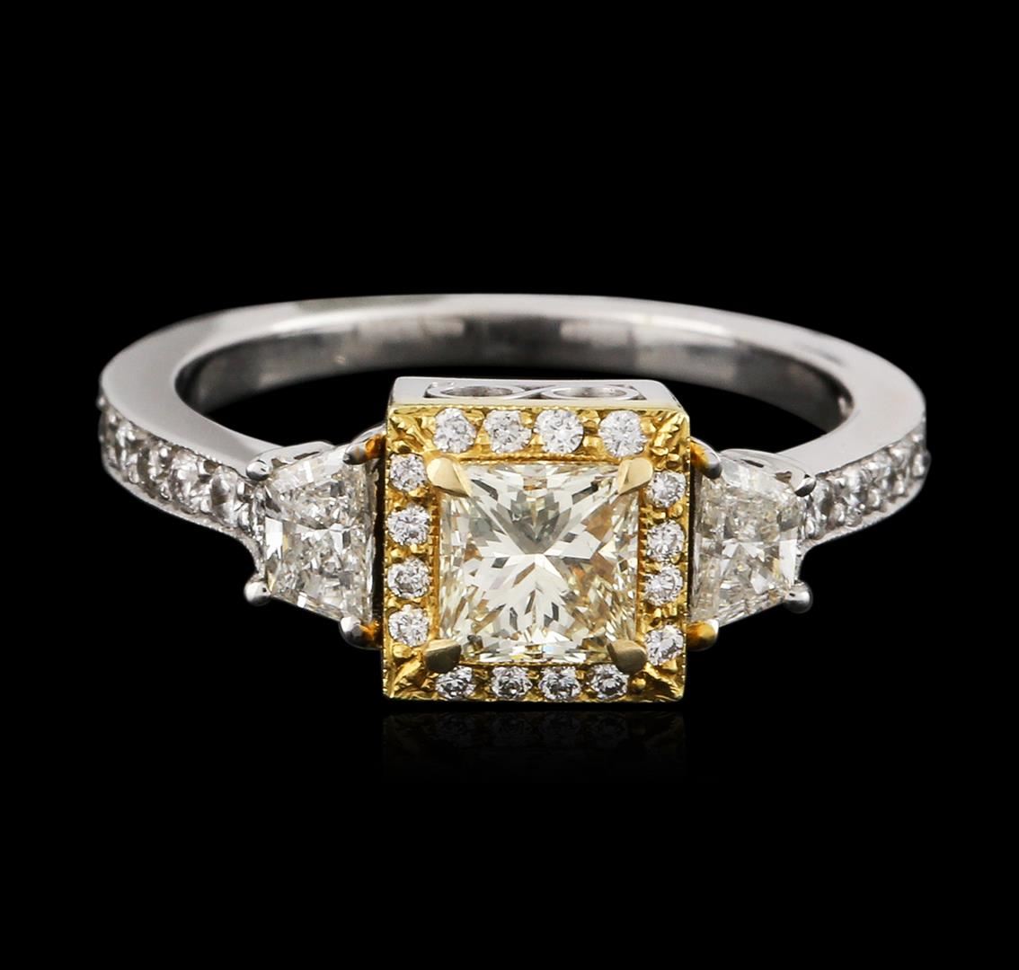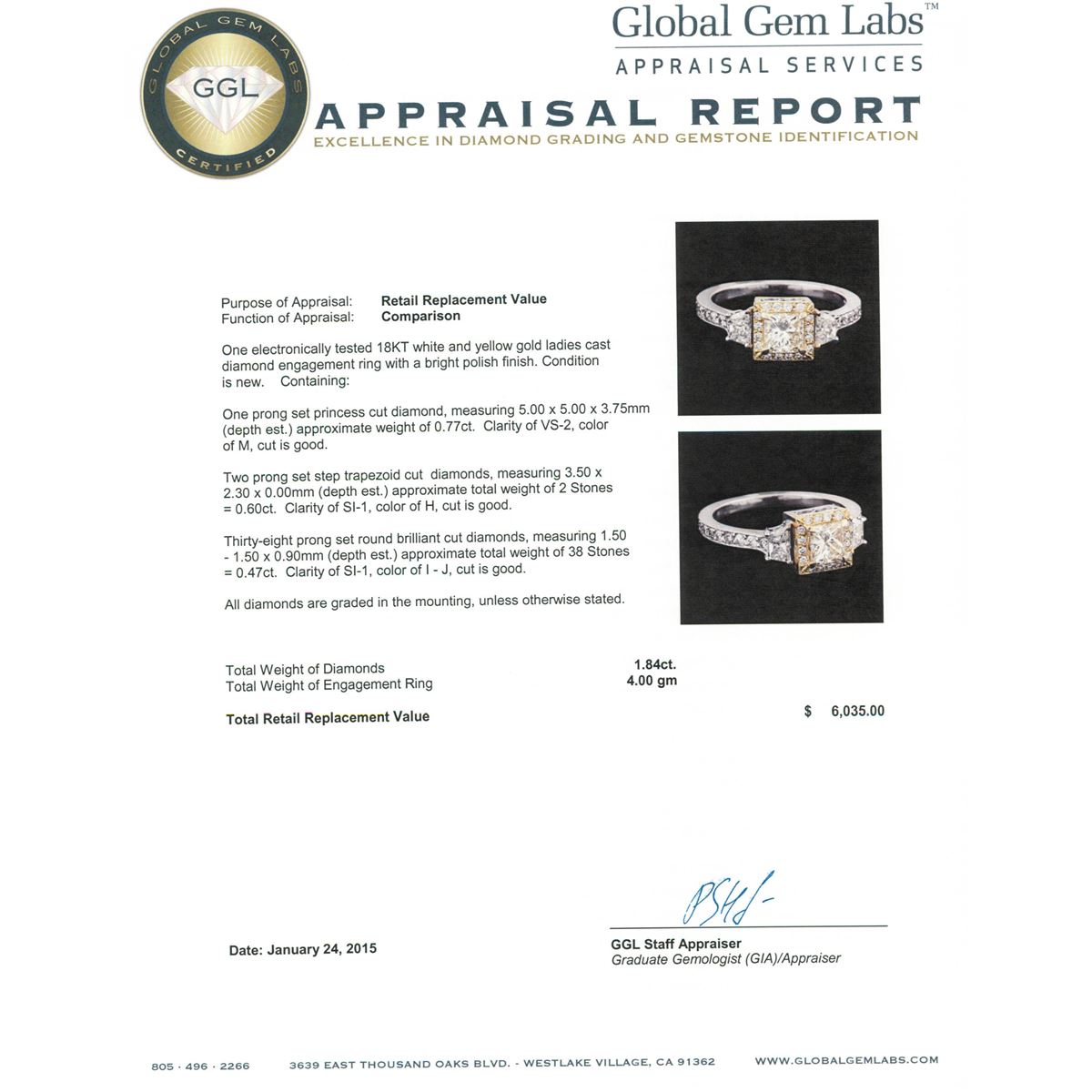 One electronically tested 18KT white and yellow gold ladies cast diamond engagement ring with a bright polish finish. Condition is new. Containing: One prong set princess cut diamond, measuring 5.00. x 5.00. x 3.75mm (depth est.) approximate weight of 0.77ct. Clarity: VS-2. Color: M, Cut is Good. Two prong set step trapezoid cut diamonds, measuring 3.50 x 2.30 x 0.00.mm (depth est.) approximate total weight of 2 Stones = 0.60ct. Clarity: SI-1. Color: H, Cut is Good. Thirty-Eight prong set round brilliant cut diamonds, measuring 1.50 - 1.50 x 0.90mm (depth est.) approximate total weight of 38 Stones = 0.47ct. Clarity: SI-1. Color: I - J, Cut is Good. All diamonds are graded in the mounting, unless otherwise stated. Total Weight of Diamonds 1.84ct. Total Weight of Engagement Ring 4.00. grams. GGL Appraised at $6,035.00.
