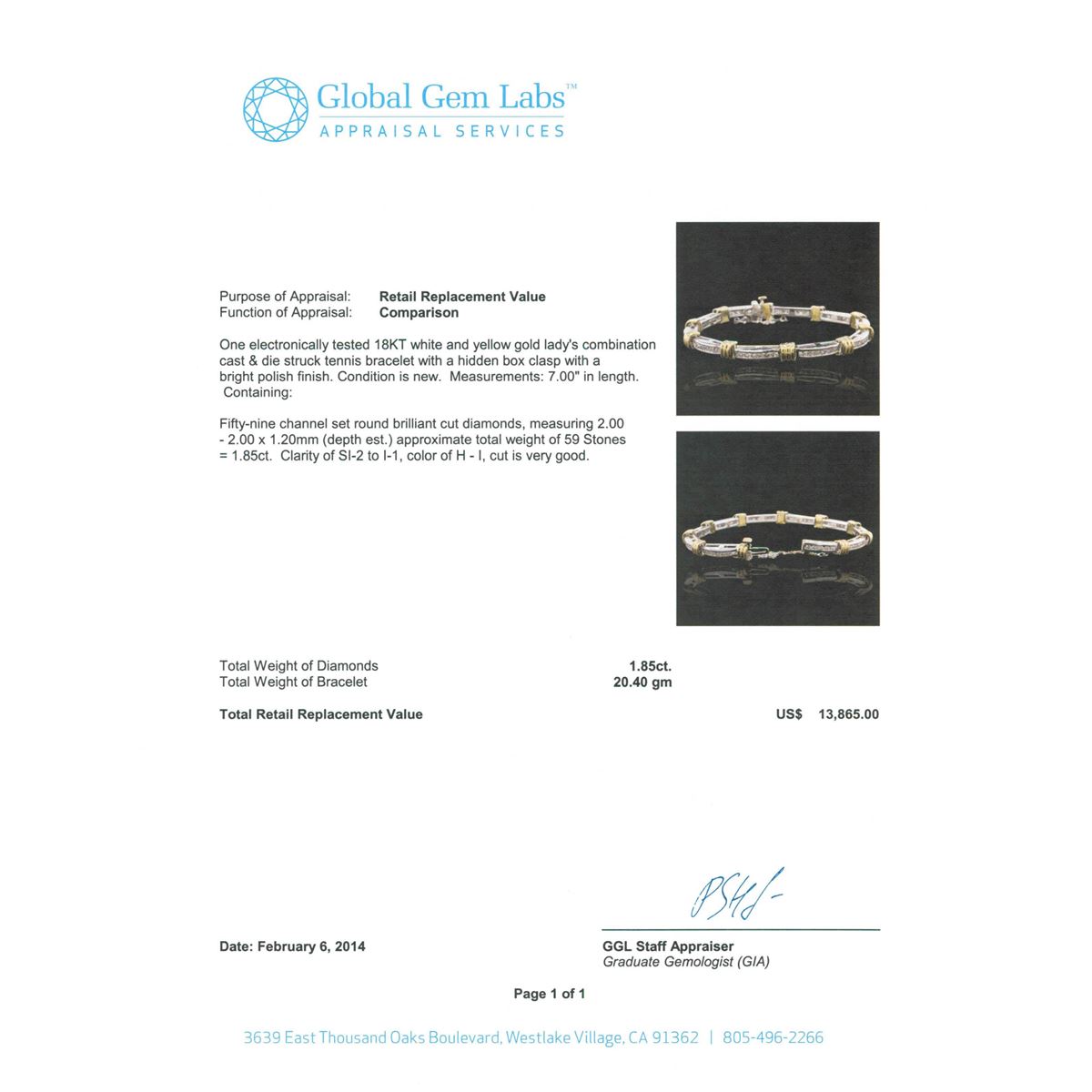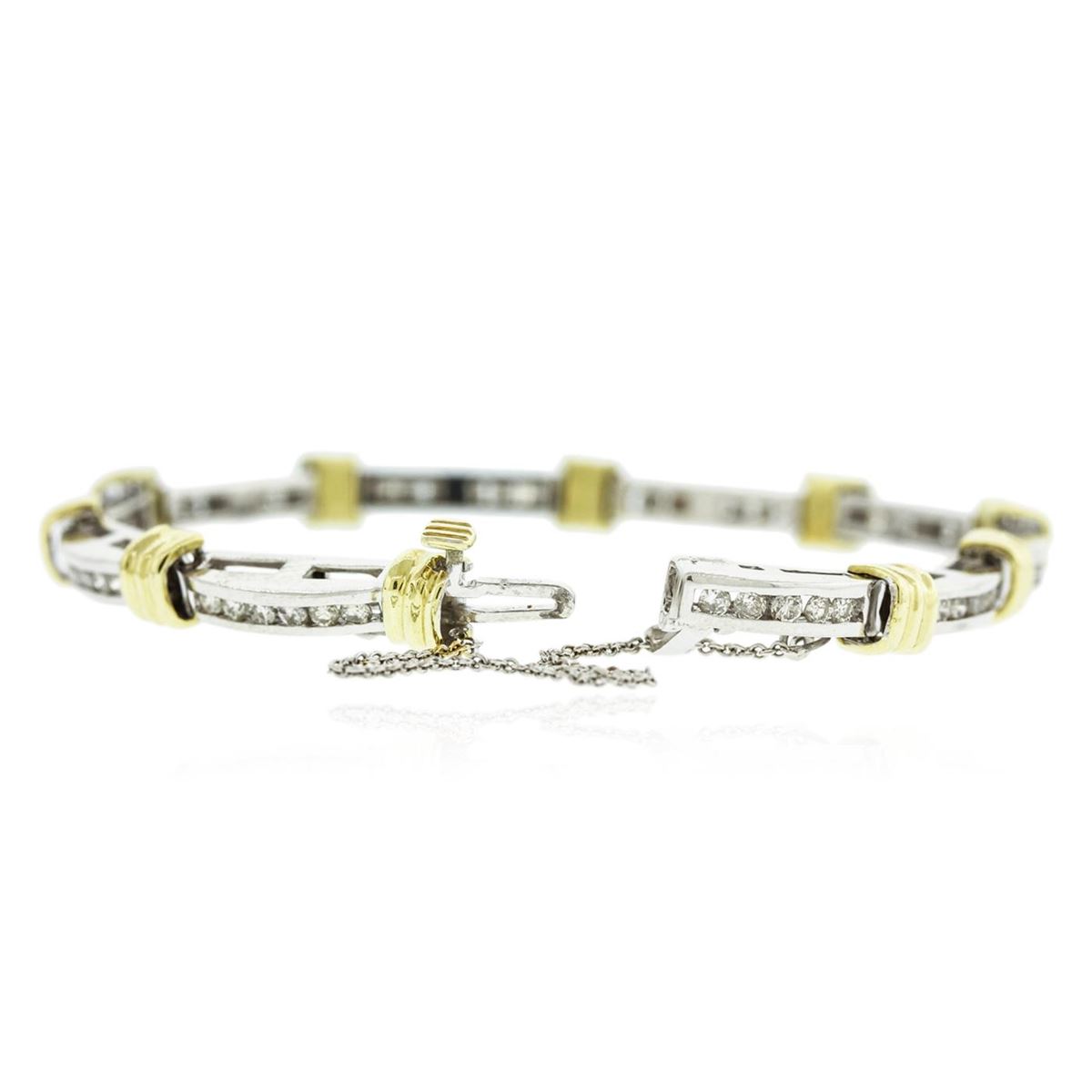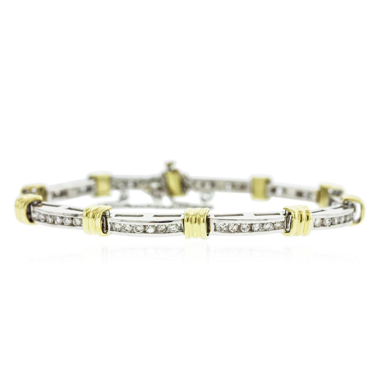 One electronically tested 18KT white and yellow gold Ladies combination cast & die struck tennis bracelet with a hidden box clasp with a bright polish finish. Measurements: 7.00" in length. Condition is new. Containing: Fifty-Nine channel set round brilliant cut diamonds, measuring 2.00 - 2.00 x 1.20mm (depth est.) approximate total weight of 59 Stones = 1.85ct. Clarity of SI-2 to I-1, Color of H - I, Cut is Very Good. Total Weight of Diamonds 1.85ct. Total Weight of Bracelet 20.40gm. GGL Appraised at $13,865.00.