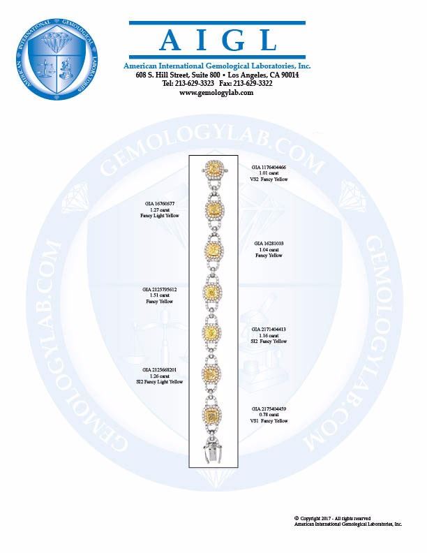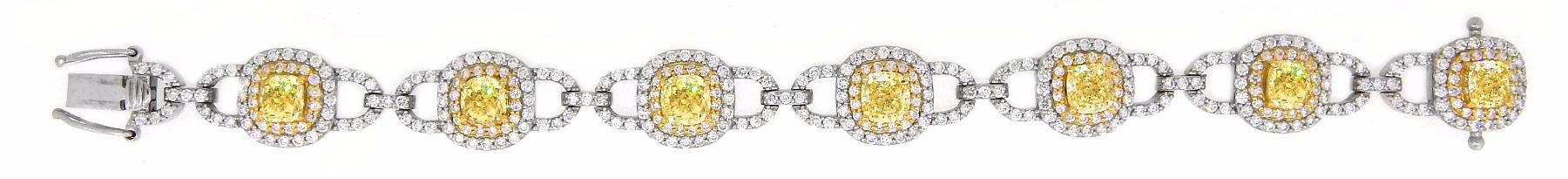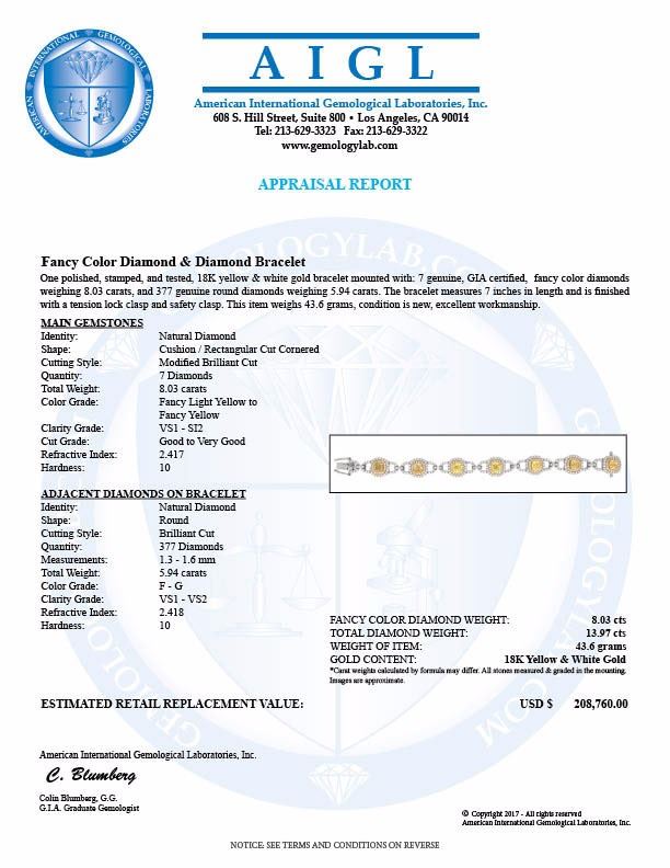 One 18KT Two Tone Gold 13.97ctw GIA Cert Fancy Yellow Diamond Bracelet. (7) GIA Certified Diamonds with a total weight of 8.03cts with a color of Fancy light yellow to Fancy Yellow. (377) Diamonds with a total weight of 5.94cts with a color of F-G and clarity of VS-1 to VS-2. Total weight of this bracelet is 43.60 grams.