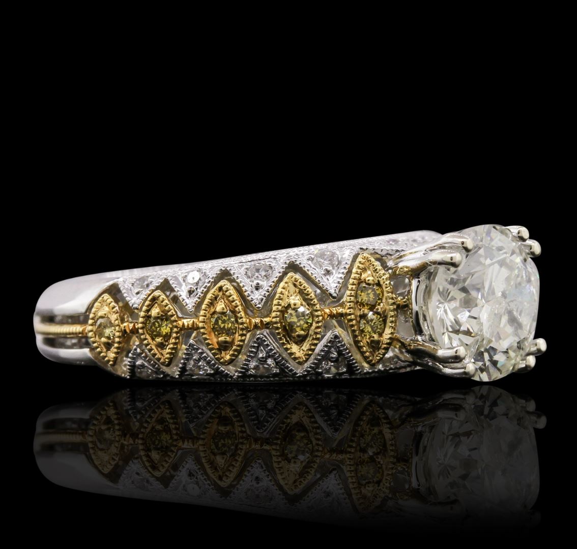 One electronically tested 18KT white and yellow gold ladies cast & assembled diamond ring. Condition is new, good workmanship. The featured diamond is supported by elaborate white and yellow diamond shoulders, completed by a three and one-half millimeter wide band. Bright polish finish with milgrain detailing throughout. Identified with markings of "18K". Containing: One prong set round brilliant cut diamond, measuring 7.20 - 7.20 x 4.85mm (depth est.) approximate weight of 1.63ct. Graded in the setting. Clarity: I-1 . Color: L Depth 67.4%. Table 59.7%. Twenty-Two bead set round brilliant cut diamonds, measuring 1.30 - 1.00 x 0.69mm (depth est.) approximate. Total Weight of 22 Stones = 0.22ct. Graded in the setting. Clarity: VS-2 to SI-1 . Color: G - I Twelve bead set round brilliant cut diamonds, measuring 1.40 - 1.30 x 0.81mm (depth est.) approximate. Total Weight of 12 Stones = 0.20ct. Indications of laboratory enhanced color. Graded in the setting. Clarity: VS-2 to SI-2 .. Total Weight of Diamonds 2.05ct.. Total Weight of Ring 5.76 grams. AIG Appraised at $22,775.00.