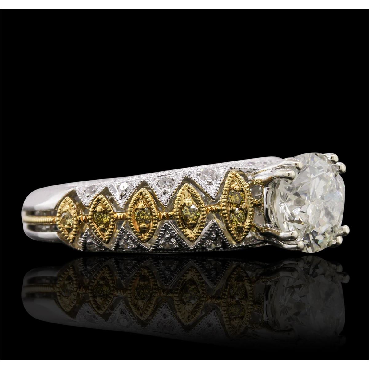 One electronically tested 18KT white and yellow gold ladies cast & assembled diamond ring. Condition is new, good workmanship. The featured diamond is supported by elaborate white and yellow diamond shoulders, completed by a three and one-half millimeter wide band. Bright polish finish with milgrain detailing throughout. Identified with markings of "18K". Containing: One prong set round brilliant cut diamond, measuring 7.20 - 7.20 x 4.85mm (depth est.) approximate weight of 1.63ct. Graded in the setting. Clarity: I-1 . Color: L Depth 67.4%. Table 59.7%. Twenty-Two bead set round brilliant cut diamonds, measuring 1.30 - 1.00 x 0.69mm (depth est.) approximate. Total Weight of 22 Stones = 0.22ct. Graded in the setting. Clarity: VS-2 to SI-1 . Color: G - I Twelve bead set round brilliant cut diamonds, measuring 1.40 - 1.30 x 0.81mm (depth est.) approximate. Total Weight of 12 Stones = 0.20ct. Indications of laboratory enhanced color. Graded in the setting. Clarity: VS-2 to SI-2 .. Total Weight of Diamonds 2.05ct.. Total Weight of Ring 5.76 grams. AIG Appraised at $22,775.00.