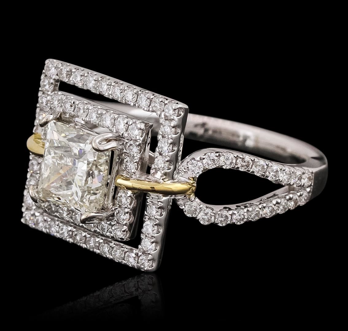 One electronically tested 18KT white and yellow gold ladies combination cast & assembled engagement ring with a bright polish finish. Identified with markings of "18K". Condition is new. Containing: One prong set princess cut diamond, measuring 6.10 x 5.95 x 4.46mm (depth est.) approximate weight of 1.33ct. Clarity: I-1. Color: K, Cut is Good. Ninety prong set round brilliant cut diamonds, measuring 1.20 - 1.20 x 0.72mm (depth est.) approximate total weight of 90 Stones = 0.76ct. Clarity: SI-1 to I-1. Color: H - I, Cut is Good. All diamonds are graded in the mounting, unless otherwise stated. Total Weight of Diamonds 2.09ct. Total Weight of Ring 6.10 grams. GGL Appraised at $19,925.00.