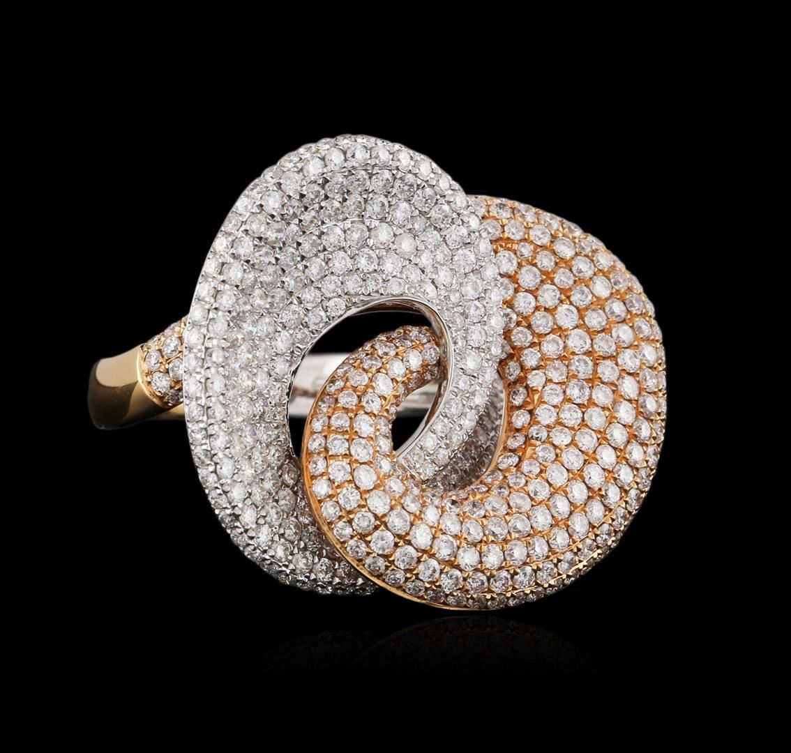 One electronically tested 18KT rose and white gold ladies cast diamond ring with a bright polish finish. Identified with markings of "18K". Condition is new. Containing: Two Hundred Eighty prong set round brilliant cut diamonds, measuring 1.30 - 1.30 x 0.78mm (depth est.) approximate total weight of 280 Stones = 2.24ct. Clarity: SI-2 to I-1. Color: H - I, Cut is Good. All diamonds are graded in the mounting, unless otherwise stated. Total Weight of Diamonds 2.24ct. Total Weight of Ring 7.90 grams. GGL Appraised at $4,625.00.