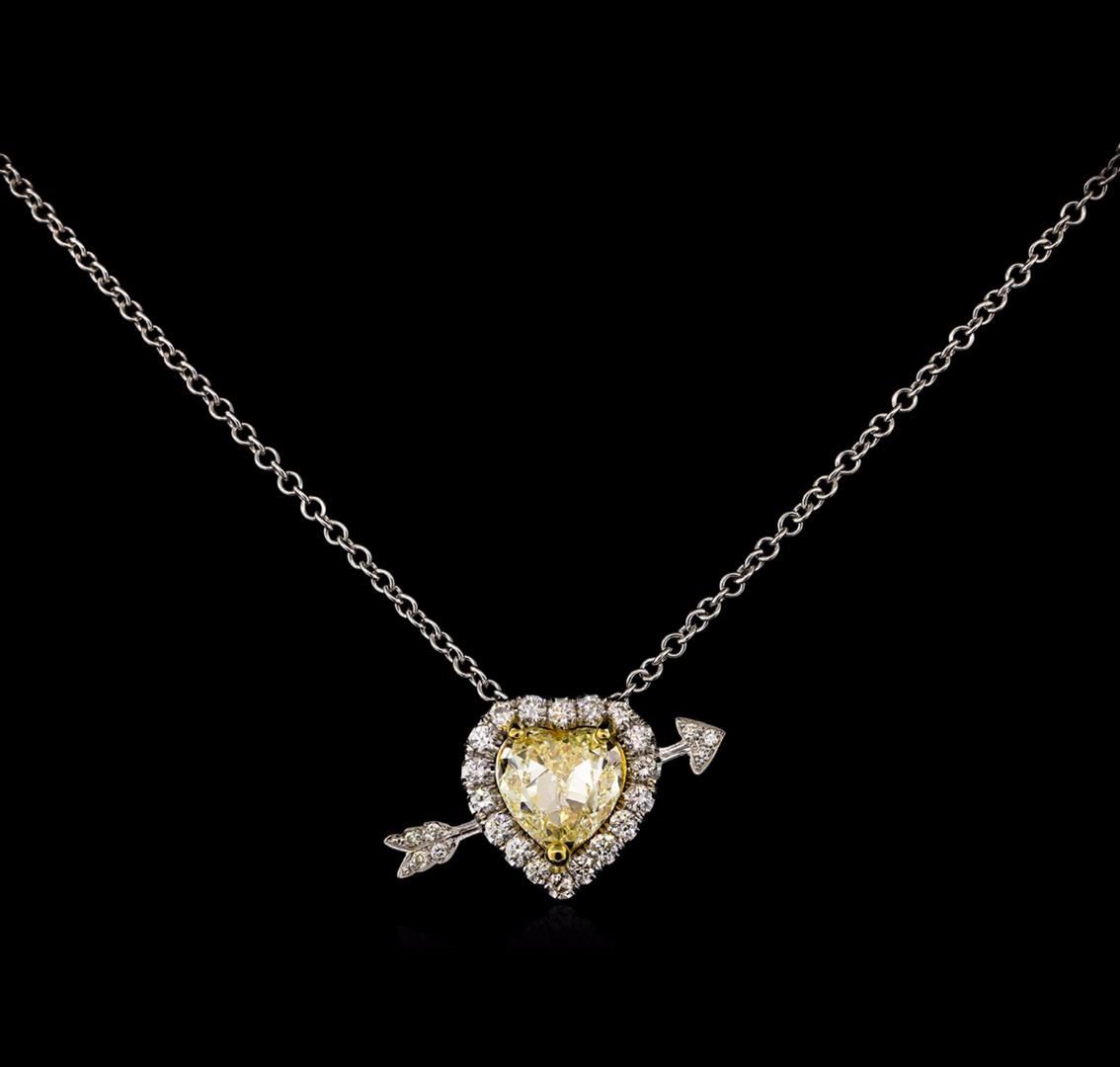 One electronically tested 18KT yellow & white gold ladies cast & assembled diamond "Heart with Arrow" pendant with chain. Condition is new, good workmanship. The slide pendant features a heart shaped pendant composed of a heart shaped diamond mounted in an 18KT yellow gold basket set within a diamond bezel, accented with an 18KT white gold arrow through it. The pendant is supported by an eighteen inch length 18KT white gold designer style chain terminating in a lobster claw clasp. Bright polish finish. Containing: One prong set heart shaped cut diamond, measuring 8.00 x 7.07 x 4.45mm (depth est.), 17.00.%. GTCF approximate weight of 1.81ct with a faint blue fluorescence. Diamond Grading Report attached. Graded in the setting. Clarity: VS-2. Depth: 62.9%. Table 63.7%. Eighteen prong set round brilliant cut diamonds, measuring 1.80 - 1.50 x 0.99mm (depth est.) approximate. Total Weight of 18 Stones = 0.41ct. Graded in the setting. Clarity: VS-1 to SI-1. Color: F - H Seven bead set round brilliant cut diamonds, measuring 1.00 - 1.00 x 0.60mm (depth est.) approximate. Total Weight of 7 Stones = 0.03ct. Graded in the setting. Clarity: SI-1 to I-1. Color: H - J. Total Weight of Diamonds 2.25ct. Total Weight of Pendant With Chain 7.40 grams. AIG Appraised at $22,040.00.