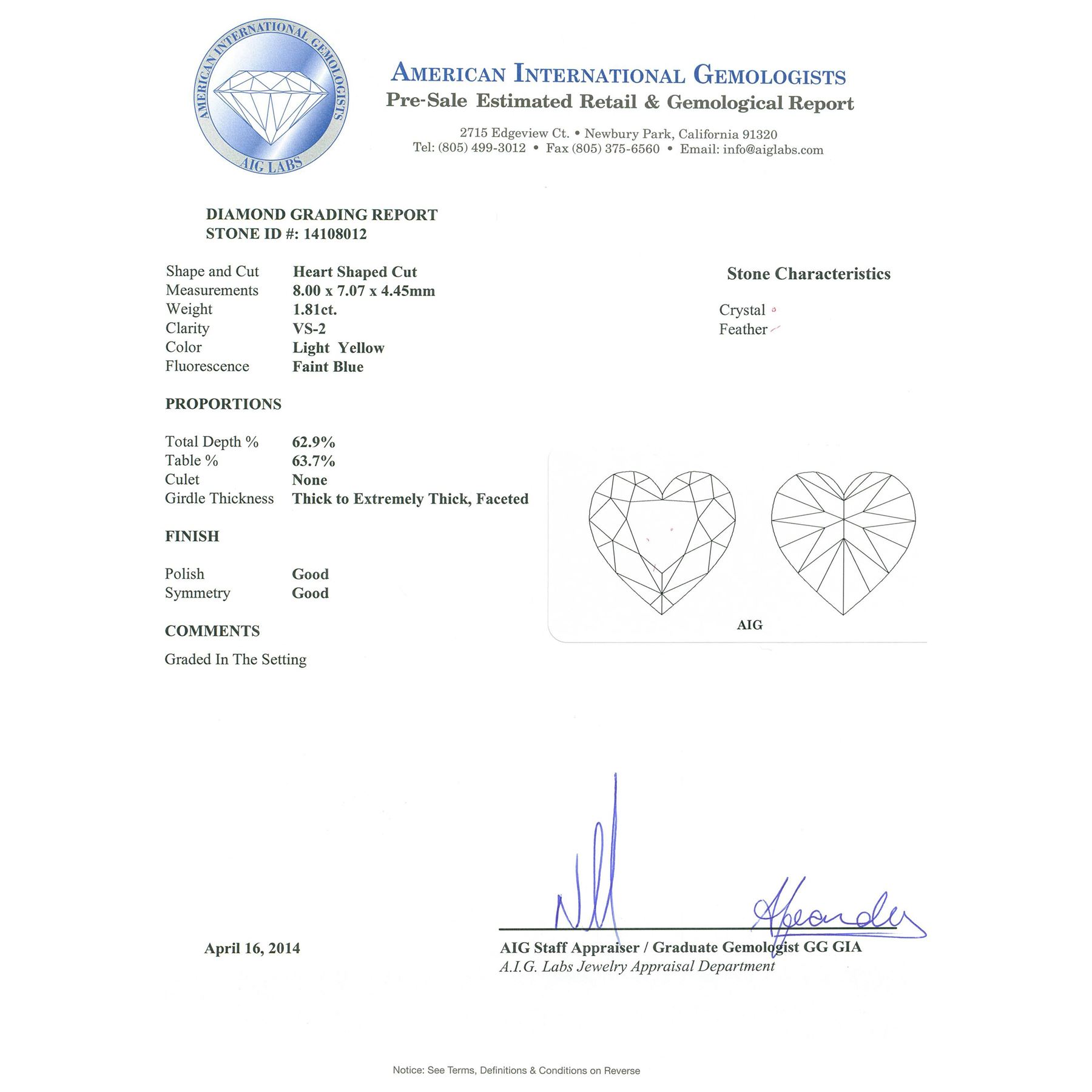 One electronically tested 18KT yellow & white gold ladies cast & assembled diamond "Heart with Arrow" pendant with chain. Condition is new, good workmanship. The slide pendant features a heart shaped pendant composed of a heart shaped diamond mounted in an 18KT yellow gold basket set within a diamond bezel, accented with an 18KT white gold arrow through it. The pendant is supported by an eighteen inch length 18KT white gold designer style chain terminating in a lobster claw clasp. Bright polish finish. Containing: One prong set heart shaped cut diamond, measuring 8.00 x 7.07 x 4.45mm (depth est.), 17.00.%. GTCF approximate weight of 1.81ct with a faint blue fluorescence. Diamond Grading Report attached. Graded in the setting. Clarity: VS-2. Depth: 62.9%. Table 63.7%. Eighteen prong set round brilliant cut diamonds, measuring 1.80 - 1.50 x 0.99mm (depth est.) approximate. Total Weight of 18 Stones = 0.41ct. Graded in the setting. Clarity: VS-1 to SI-1. Color: F - H Seven bead set round brilliant cut diamonds, measuring 1.00 - 1.00 x 0.60mm (depth est.) approximate. Total Weight of 7 Stones = 0.03ct. Graded in the setting. Clarity: SI-1 to I-1. Color: H - J. Total Weight of Diamonds 2.25ct. Total Weight of Pendant With Chain 7.40 grams. AIG Appraised at $22,040.00.