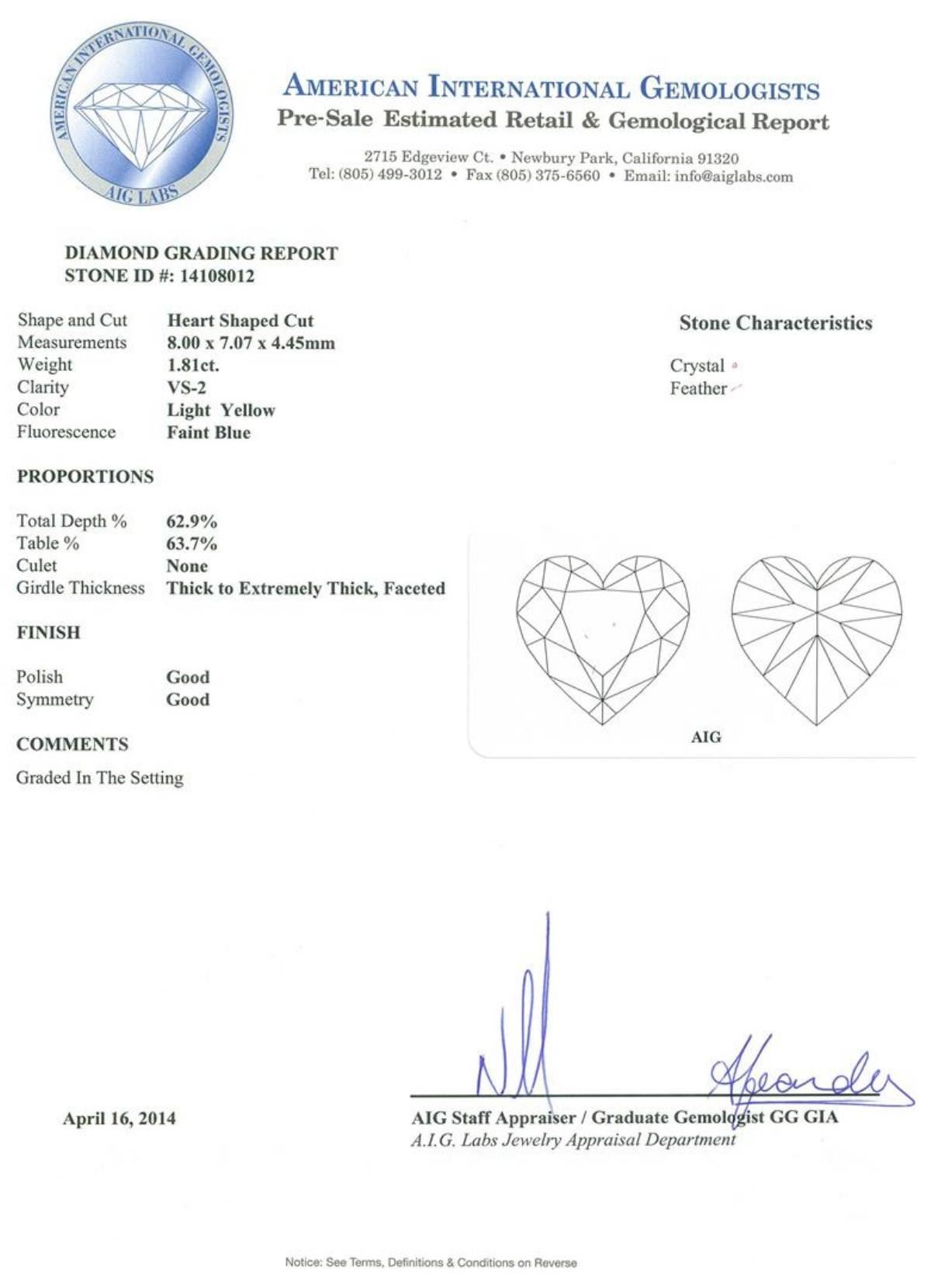 One electronically tested 18KT yellow & white gold ladies cast & assembled diamond "Heart with Arrow" pendant with chain. Condition is new, good workmanship. The slide pendant features a heart shaped pendant composed of a heart shaped diamond mounted in an 18KT yellow gold basket set within a diamond bezel, accented with an 18KT white gold arrow through it. The pendant is supported by an eighteen inch length 18KT white gold designer style chain terminating in a lobster claw clasp. Bright polish finish. Containing: One prong set heart shaped cut diamond, measuring 8.00 x 7.07 x 4.45mm (depth est.), 17.00.%. GTCF approximate weight of 1.81ct with a faint blue fluorescence. Diamond Grading Report attached. Graded in the setting. Clarity: VS-2. Depth: 62.9%. Table 63.7%. Eighteen prong set round brilliant cut diamonds, measuring 1.80 - 1.50 x 0.99mm (depth est.) approximate. Total Weight of 18 Stones = 0.41ct. Graded in the setting. Clarity: VS-1 to SI-1. Color: F - H Seven bead set round brilliant cut diamonds, measuring 1.00 - 1.00 x 0.60mm (depth est.) approximate. Total Weight of 7 Stones = 0.03ct. Graded in the setting. Clarity: SI-1 to I-1. Color: H - J. Total Weight of Diamonds 2.25ct. Total Weight of Pendant With Chain 7.40 grams. AIG Appraised.