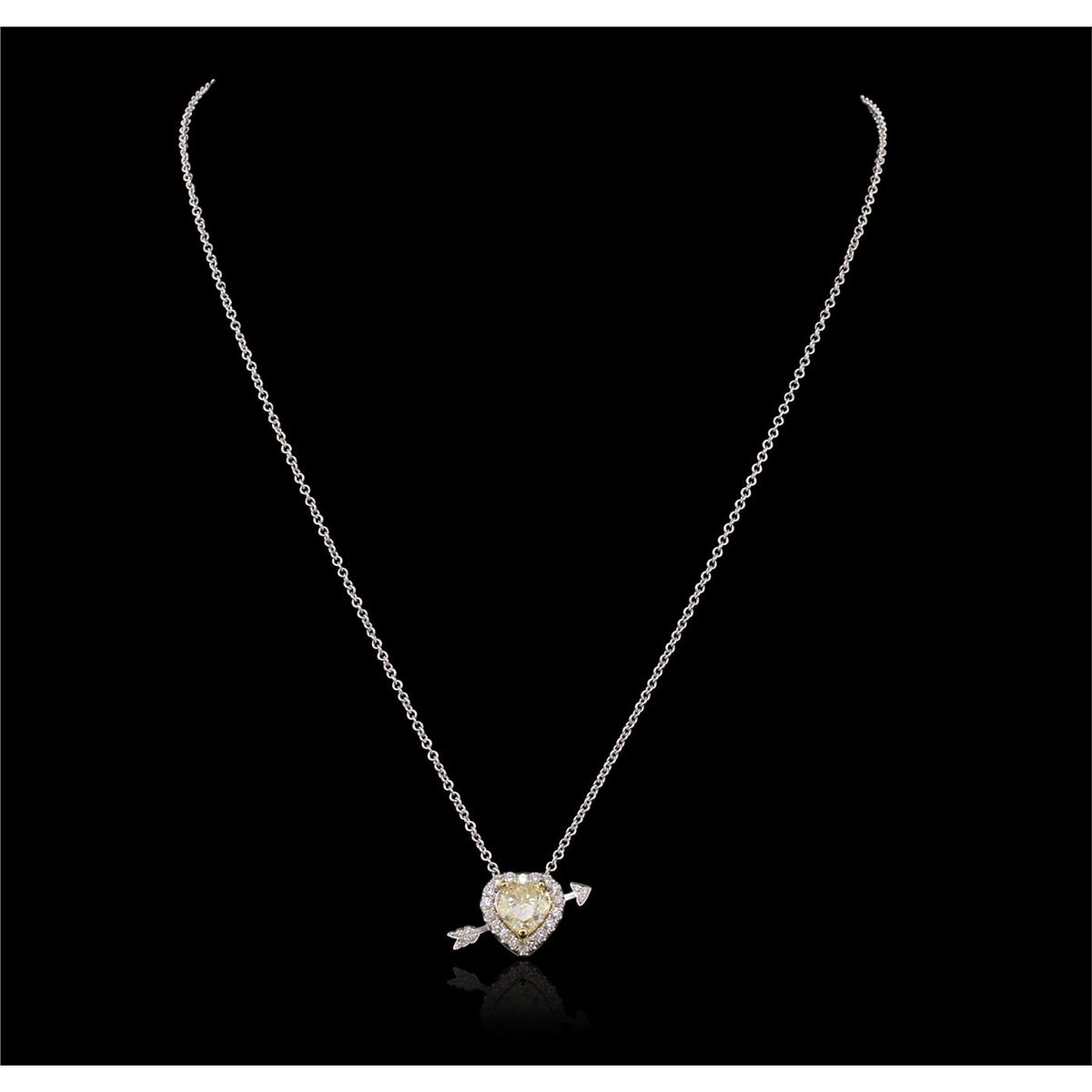 One electronically tested 18KT yellow & white gold ladies cast & assembled diamond "Heart with Arrow" pendant with chain. Condition is new, good workmanship. The slide pendant features a heart shaped pendant composed of a heart shaped diamond mounted in an 18KT yellow gold basket set within a diamond bezel, accented with an 18KT white gold arrow through it. The pendant is supported by an eighteen inch length 18KT white gold designer style chain terminating in a lobster claw clasp. Bright polish finish. Containing: One prong set heart shaped cut diamond, measuring 8.00 x 7.07 x 4.45mm (depth est.), 17.00.%. GTCF approximate weight of 1.81ct with a faint blue fluorescence. Diamond Grading Report attached. Graded in the setting. Clarity: VS-2. Depth: 62.9%. Table 63.7%. Eighteen prong set round brilliant cut diamonds, measuring 1.80 - 1.50 x 0.99mm (depth est.) approximate. Total Weight of 18 Stones = 0.41ct. Graded in the setting. Clarity: VS-1 to SI-1. Color: F - H Seven bead set round brilliant cut diamonds, measuring 1.00 - 1.00 x 0.60mm (depth est.) approximate. Total Weight of 7 Stones = 0.03ct. Graded in the setting. Clarity: SI-1 to I-1. Color: H - J. Total Weight of Diamonds 2.25ct. Total Weight of Pendant With Chain 7.40 grams. AIG Appraised at $22,040.00.