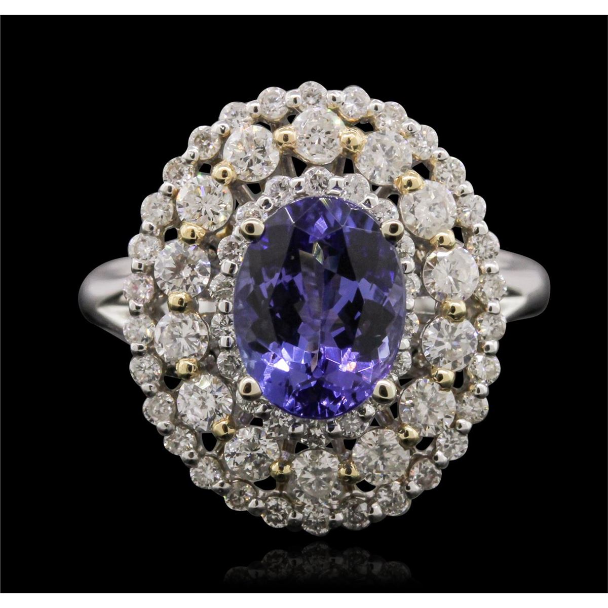 One electronically tested 18KT white and yellow gold Ladies combination cast & assembled fancy ring with a bright polish finish. Identified with markings of "18K". Condition is new. Containing: Eighteen prong set round brilliant cut diamonds, measuring 1.20 - 1.20 x 0.72mm (depth est.) approximate. Total Weight of 18 Stones = 0.15ct. Clarity: I-1. Color: G - H, Cut is Good. Thirty prong set round brilliant cut diamonds, measuring 1.30 - 1.30 x 0.78mm (depth est.) approximate. Total Weight of 30 Stones = 0.30ct. Clarity: I-1. Color: G - H, Cut is Good. Fourteen prong set round brilliant cut diamonds, measuring 2.20 - 2.20 x 1.32mm (depth est.) approximate. Total Weight of 14 Stones = 0.65ct. Clarity: I-1. Color: G - H, Cut is Good. One prong set oval modified mixed cut natural tanzanite, measuring 9.00 x 7.00 x 4.55mm, approximate weight of 2.28ct., clarity is eye clean, type I, medium light, very slightly grayish, violet color, (GIA V 4/3), cut is very good. Colored gemstones are presumed to have been subjected to commonly used color/clarity enhancement processes. Total Weight of Colored Stones 2.28ct. Total Weight of Diamonds 1.10ct. Total Weight of Ring 8.00 grams. GGL Appraised at $7,550.00.