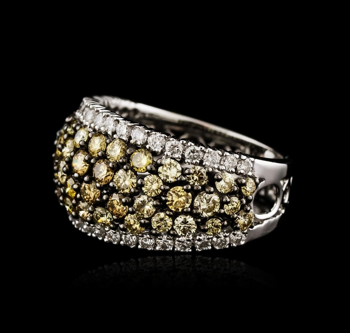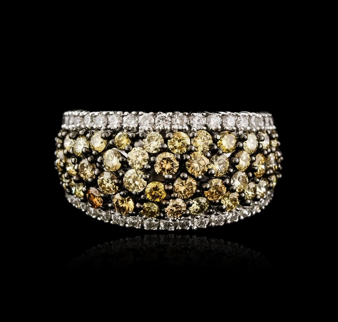 One electronically tested 18KT white and black gold ladies cast diamond ring with a tapered shank with a bright polish finish. Identified with markings of "18K". Condition is new. Containing: Forty-Seven prong set round brilliant cut diamonds, measuring 1.80 - 2.50 x 1.29mm (depth est.) approximate total weight of 47 Stones = 1.82ct. Clarity: VS-2 to SI-1, Color of Fancy Greenish Yellow, Cut is Good. Thirty-Eight prong set round brilliant cut diamonds, measuring 1.50 - 1.50 x 0.90mm (depth est.) approximate total weight of 38 Stones = 0.47ct. Clarity: SI-2 to I-1. Color: H - I, Cut is Good. All diamonds are graded in the mounting, unless otherwise stated. Total Weight of Diamonds 2.29ct. Total Weight of Ring 5.80 grams. GGL Appraised at $5,275.00.