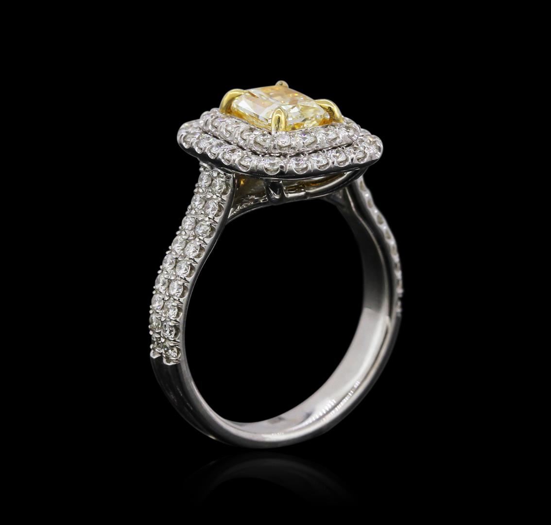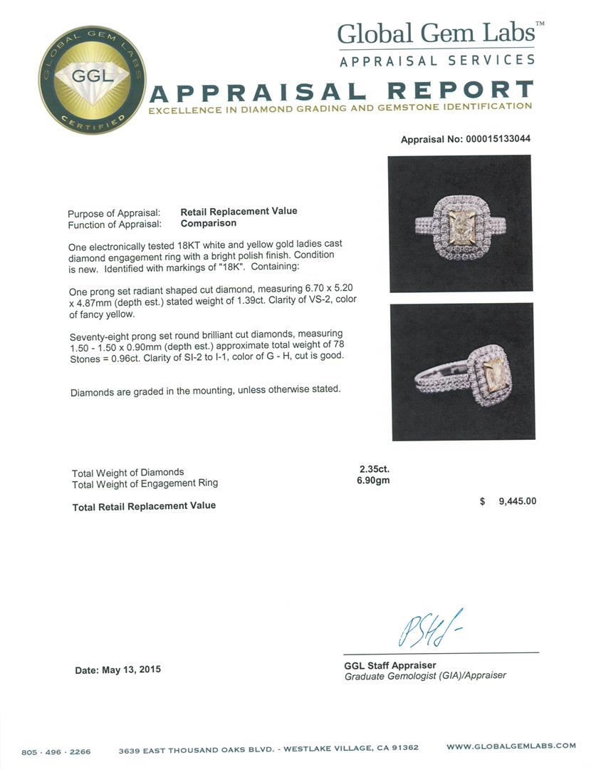 One electronically tested 18KT white and yellow gold ladies cast diamond engagement ring with a bright polish finish. Identified with markings of "18K". Condition is new. Containing: One prong set radiant shaped cut diamond, measuring 6.70 x 5.20 x 4.87mm (depth est.) stated weight of 1.39ct. Clarity: VS-2. Seventy-Eight prong set round brilliant cut diamonds, measuring 1.50 - 1.50 x 0.90mm (depth est.) approximate total weight of 78 Stones = 0.96ct. Clarity: SI-2 to I-1. Color: G - H, Cut is Good. Diamonds are graded in the mounting, unless otherwise stated. Total Weight of Diamonds 2.35ct. Total Weight of Engagement Ring 6.90 grams. GGL Appraised at $9,445.00.