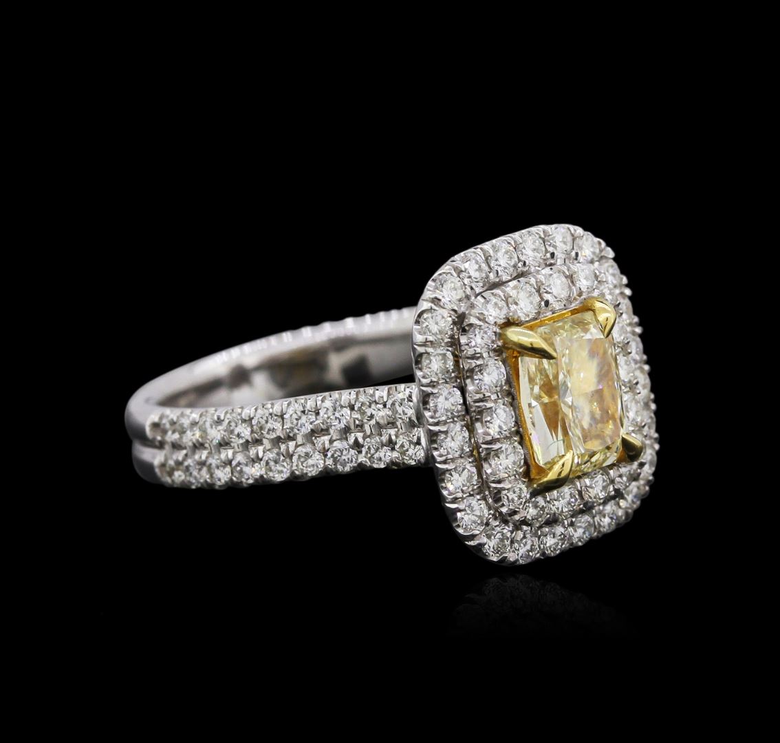 One electronically tested 18KT white and yellow gold ladies cast diamond engagement ring with a bright polish finish. Identified with markings of "18K". Condition is new. Containing: One prong set radiant shaped cut diamond, measuring 6.70 x 5.20 x 4.87mm (depth est.) stated weight of 1.39ct. Clarity: VS-2. Seventy-Eight prong set round brilliant cut diamonds, measuring 1.50 - 1.50 x 0.90mm (depth est.) approximate total weight of 78 Stones = 0.96ct. Clarity: SI-2 to I-1. Color: G - H, Cut is Good. Diamonds are graded in the mounting, unless otherwise stated. Total Weight of Diamonds 2.35ct. Total Weight of Engagement Ring 6.90 grams. GGL Appraised at $9,445.00.