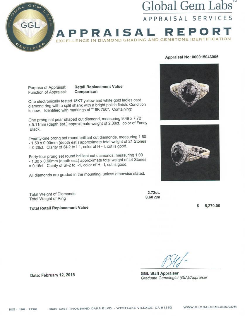 One electronically tested 18KT yellow and white gold ladies cast diamond ring with a split shank with a bright polish finish. Identified with markings of "18K 750". Condition is new. Containing: One prong set pear shaped cut diamond, measuring 9.49 x 7.72 x 5.11mm (depth est.) approximate weight of 2.30ct. Twenty-One prong set round brilliant cut diamonds, measuring 1.50 - 1.50 x 0.90mm (depth est.) approximate total weight of 21 Stones = 0.26ct. Clarity: SI-2 to I-1. Color: H - I, Cut is Good. Forty-Four prong set round brilliant cut diamonds, measuring 1.00 - 1.00 x 0.60mm (depth est.) approximate total weight of 44 Stones = 0.16ct. Clarity: SI-2 to I-1. Color: H - I, Cut is Good. All diamonds are graded in the mounting, unless otherwise stated. Total Weight of Diamonds 2.72ct. Total Weight of Ring 8.60 grams. GGL Appraised at $5,270.00.
