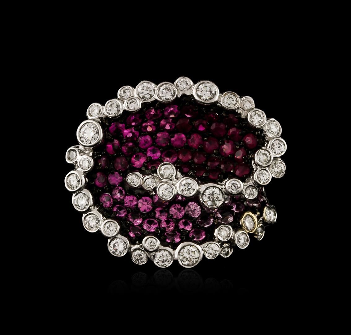 One ring featuring: 18KT two-tone gold weighing 16.40 grams containing pink sapphires with a total weight of 3.00ct and bezel set round diamonds with a total weight of 1.00ct.