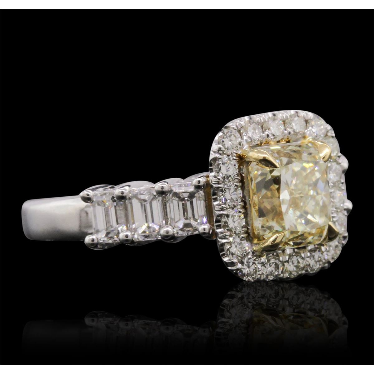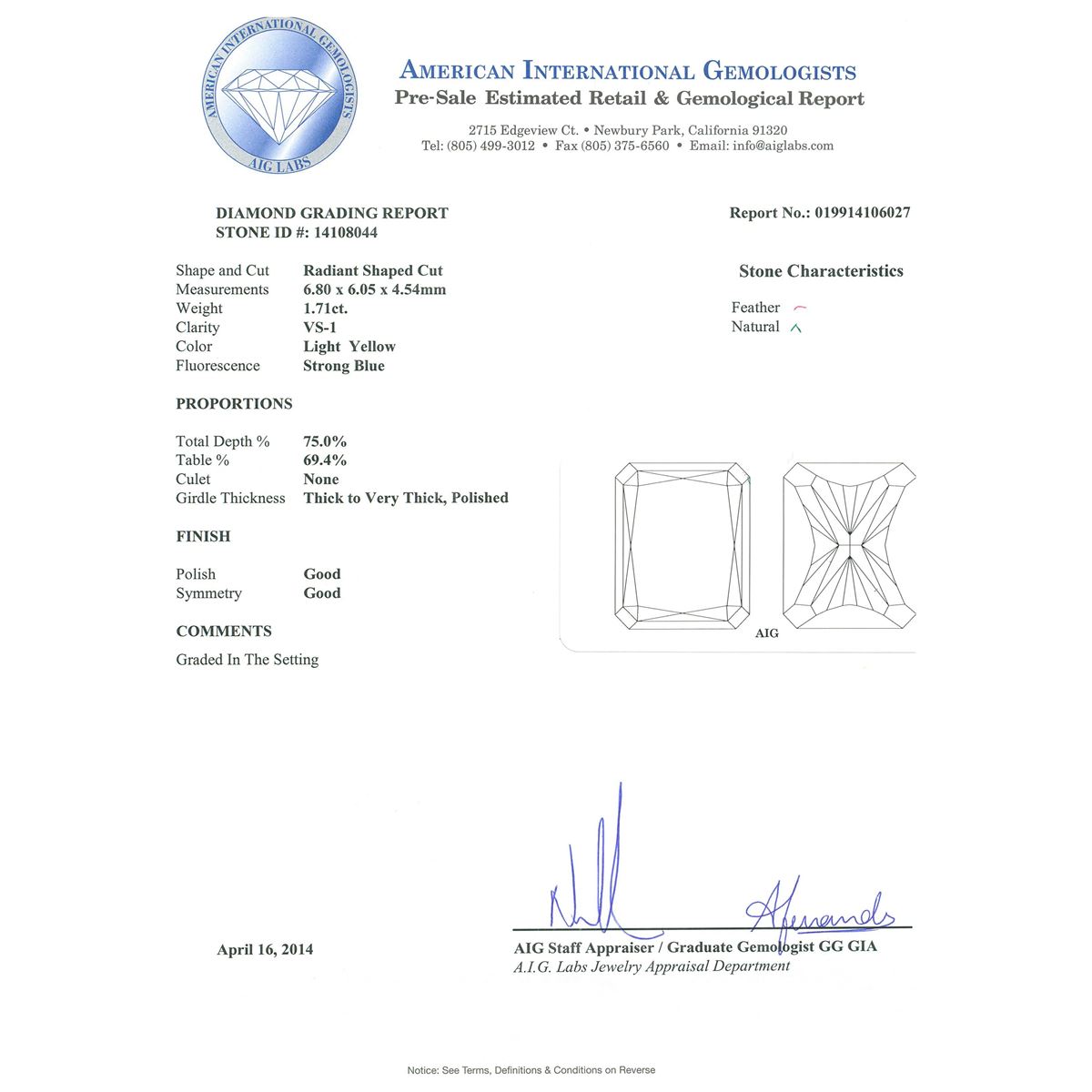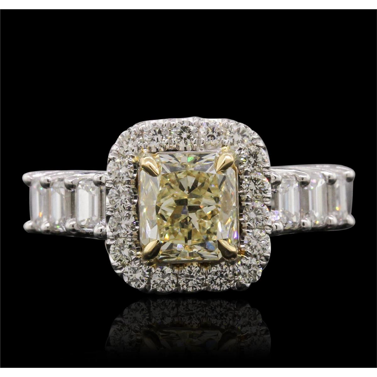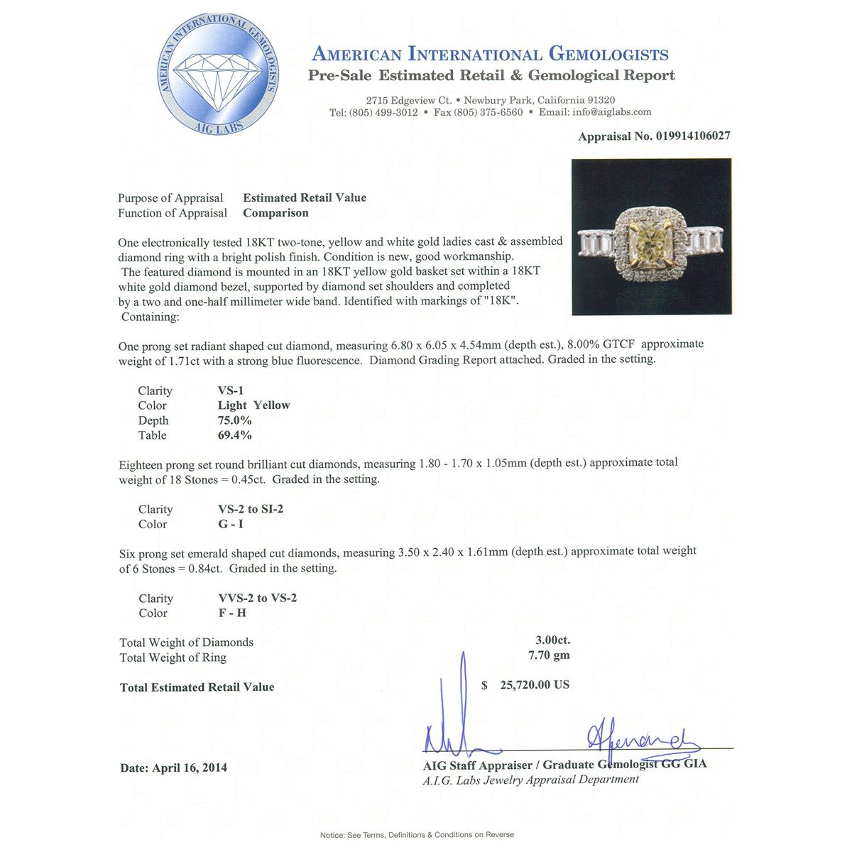 One electronically tested 18KT two-tone, yellow and white gold ladies cast & assembled diamond ring with a bright polish finish. Condition is new, good workmanship. The featured diamond is mounted in an 18KT yellow gold basket set within a 18KT white gold diamond bezel, supported by diamond set shoulders and completed by a two and one-half millimeter wide band. Identified with markings of "18K". Containing: One prong set radiant shaped cut diamond, measuring 6.80 x 6.05 x 4.54mm (depth est.), 8.00.%. GTCF approximate weight of 1.71ct with a strong blue fluorescence. Diamond Grading Report attached. Graded in the setting. Clarity: VS-1. Depth: 75.0%. Table 69.4%. Eighteen prong set round brilliant cut diamonds, measuring 1.80 - 1.70 x 1.05mm (depth est.) approximate. Total Weight of 18 Stones = 0.45ct. Graded in the setting. Clarity: VS-2 to SI-2. Color: G - I Six prong set emerald shaped cut diamonds, measuring 3.50 x 2.40 x 1.61mm (depth est.) approximate. Total Weight of 6 Stones = 0.84ct. Graded in the setting. Clarity: VVS-2 to VS-2. Color: F - H. Total Weight of Diamonds 3.00ct. Total Weight of Ring 7.70 grams. AIG Appraised at $25,720.00.