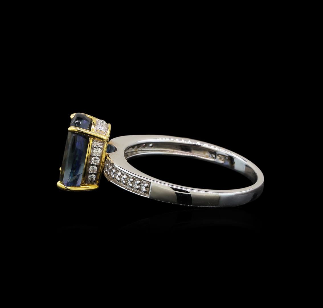 One electronically tested 18KT white and yellow gold ladies cast tanzanite and diamond ring with a bright polish finish. Identified with markings of "18K". Condition is new. Containing: One prong set oval modified brilliant cut natural tanzanite, measuring 10.00 x 8.20 x 5.33mm, approximate weight of 3.07ct., clarity is eye clean, type I, medium light, very slightly grayish, violet color, (GIA V 4/3), cut is good. Twenty-Eight prong set round brilliant cut diamonds, measuring 1.20 - 1.20 x 0.72mm (depth est.) approximate total weight of 28 Stones = 0.18ct. Clarity: I-1 to I-2. Color: I - J. Colored gemstones are presumed to have been subjected to commonly used enhancement processes. All diamonds and colored gemstones are graded in the mounting, unless otherwise stated. Total Weight of Colored Stones 3.07ct. Total Weight of Diamonds 0.18ct. Total Weight of Ring 4.30 grams. GGL Appraised at $2,955.00.